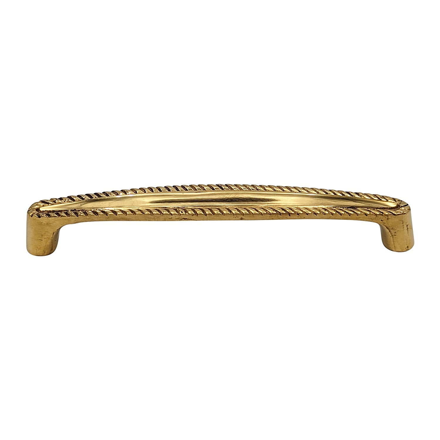 This pull measures 5 1/2 inch long and 5 inch center to center mounting distance (5.00 c-c) with a projection of 2/3 inch. Coordinating knob available. Comes complete with the mounting hardware. Comes in a variety of finishes including Polished Brass, Antique Brass, and Black Bronze.