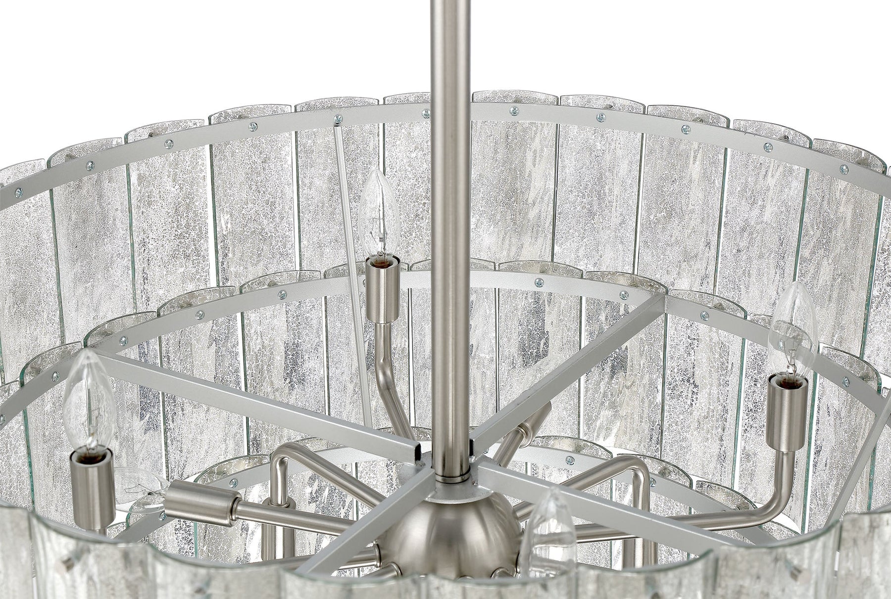 The Museo 12 Light Pendant in Brushed Polished Nickel is a stunning addition to any indoor space, combining elegance and functionality. This pendant features a sophisticated design with an antiqued mercury glass finish, adding a touch of luxury to your decor. Measuring 29.49 inches in width and depth and standing 32 inches tall, it is perfect for larger rooms. It requires 12 candelabra base E12 bulbs (not included), each with a maximum wattage of 40W, to illuminate your space beautifully. The pendant is chain hung, comes with a 6FT chain, and includes a 1-year limited warranty, ensuring both style and reliability.