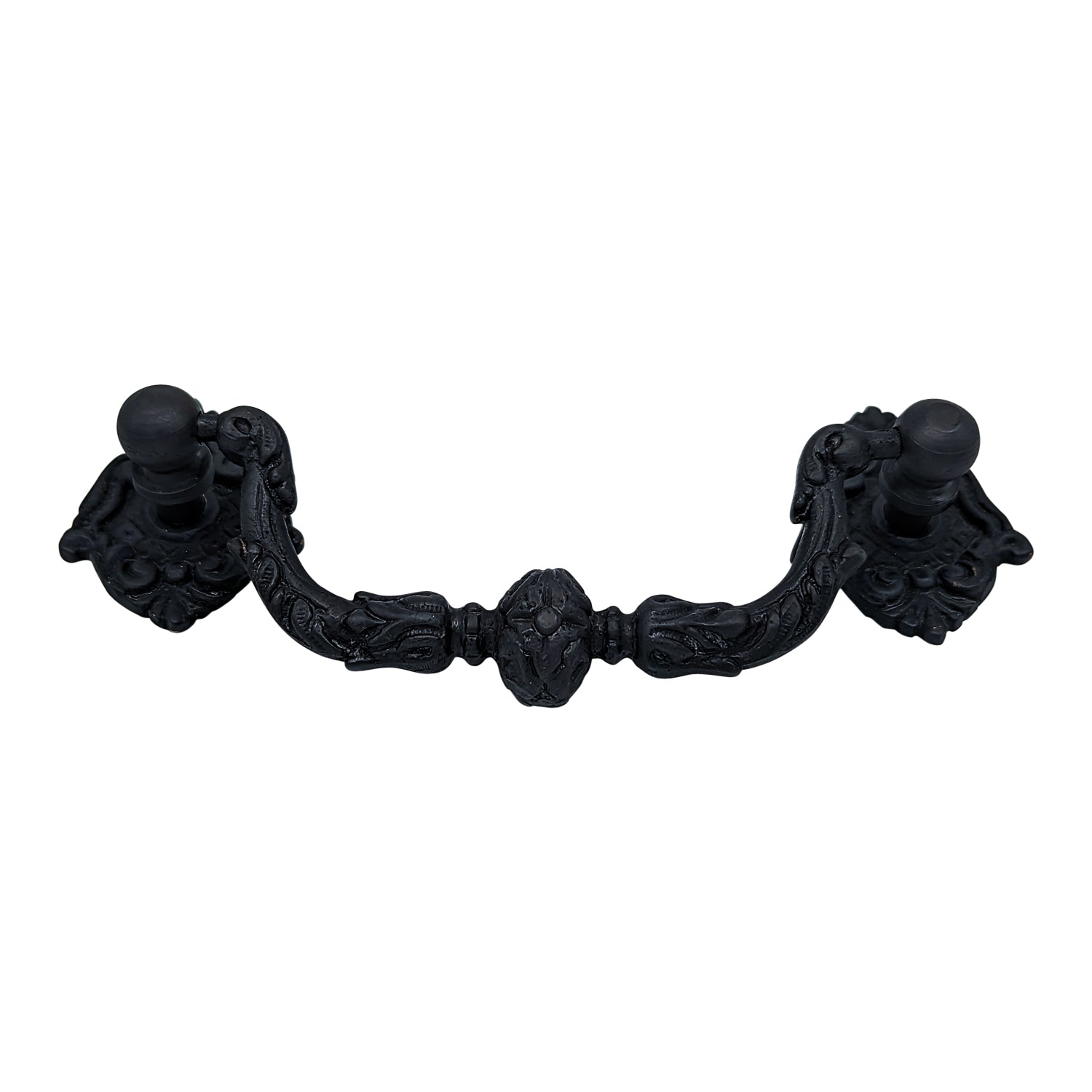This bail handle measures 3 3/4 inch center to center mounting distance (3.75 c-c). Comes complete with the mounting hardware. Available in Polished Brass or Antique Brass.