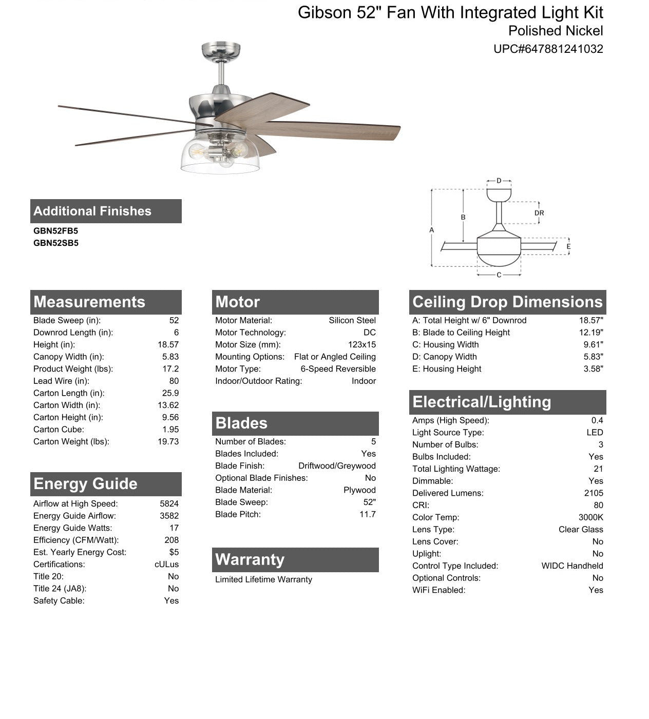 The Gibson 52" Smart ceiling fan delivers style, convenience and exceptional performance with an energy saving 6-speed, reversible DC motor, set of five reversible custom blades and integrated clear glass dome light kit with 3 x 7W dimmable LED bulbs included. The Gibson is easily controlled with included remote or the integrated Wi-Fi featuring breeze and timer functions compatible for use with most smart home devices, smart phones and systems with no additional hub needed.