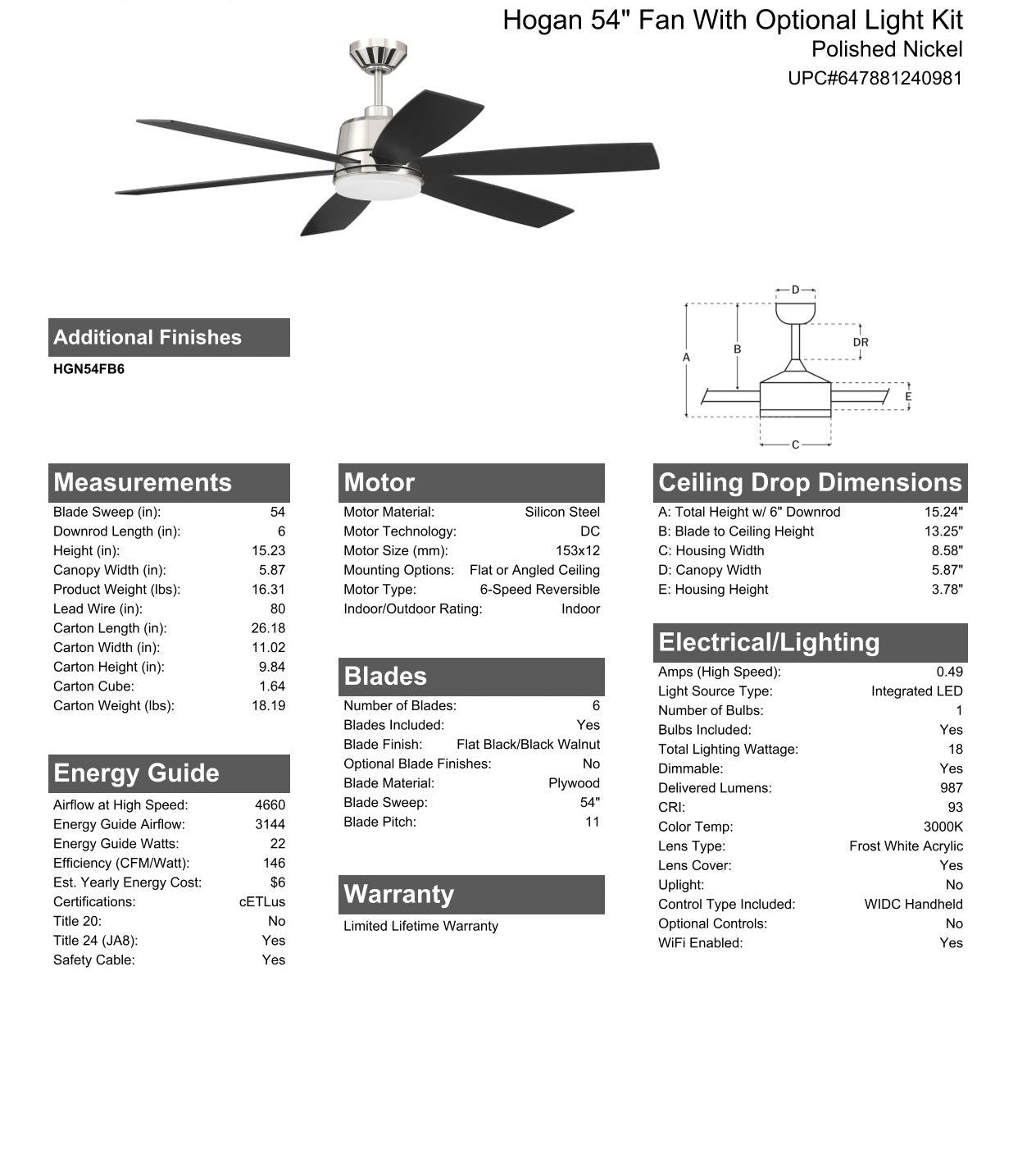 The Craftmade Hogan 54" six blade smart ceiling fan a quiet energy saving 6-speed, reversible DC motor, integrated dimmable LED light with optional lens cover and is easily controlled with either the included remote control or the integrated WIFI featuring breeze and timer functions compatible for use with most smart home devices, smart phones and systems with no additional hub needed.