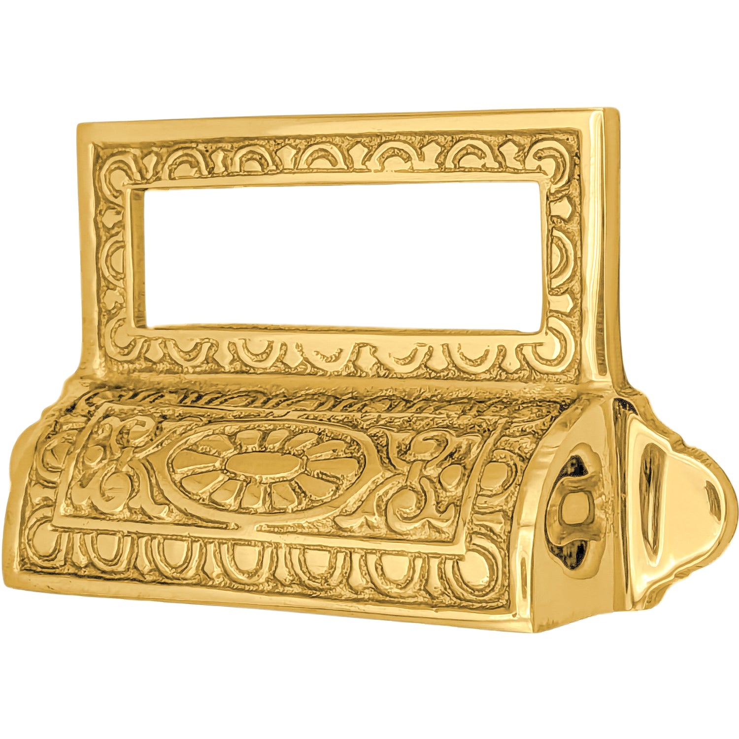Measures 4 1/8 inches long and 2 1/4 inches tall. Has a place on top to put drawer labels. Center to center spacing measures 3 1/2 inches (88.9 mm 3.50 c-c). Hand cast and hand finished piece with highly ornate detailing.