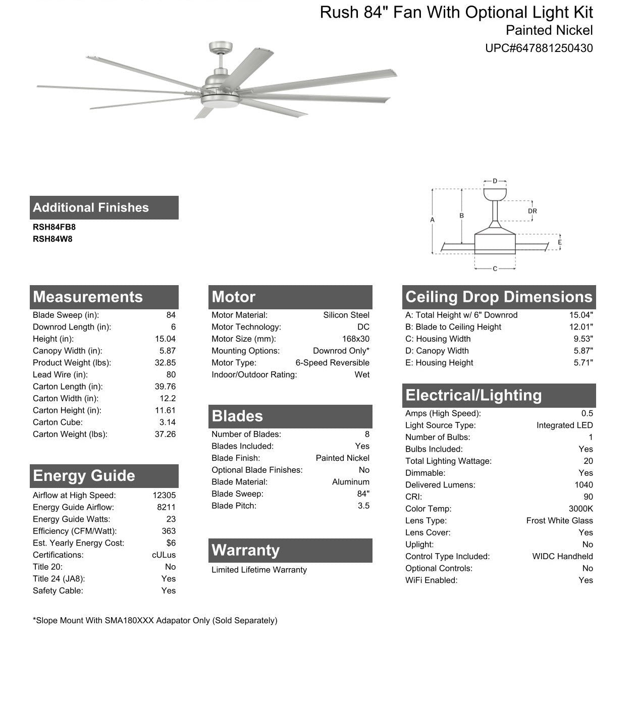 • Downrod Mount(Flat Ceiling) unless SMA180 slope adapter is used; Slope Mount with SMA180XXX adapter only-Sold Separately