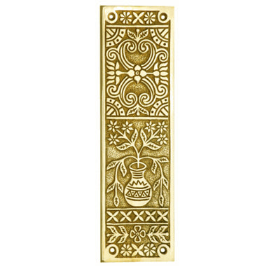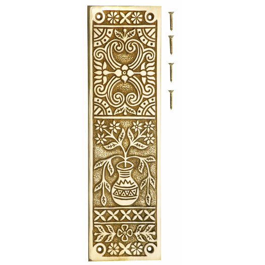 10 Inch Broken Leaf Pattern Solid Brass Push Plate (Polished Brass Finish). Plate measures 10 inch tall and 3 inch wide. Solid brass construction allows for decades of service. Comes complete with mounting hardware. Available in several finishes. This product comes as an unlacquered natural brass and it will patina over time. A high strength lacquer coating is available upon request.