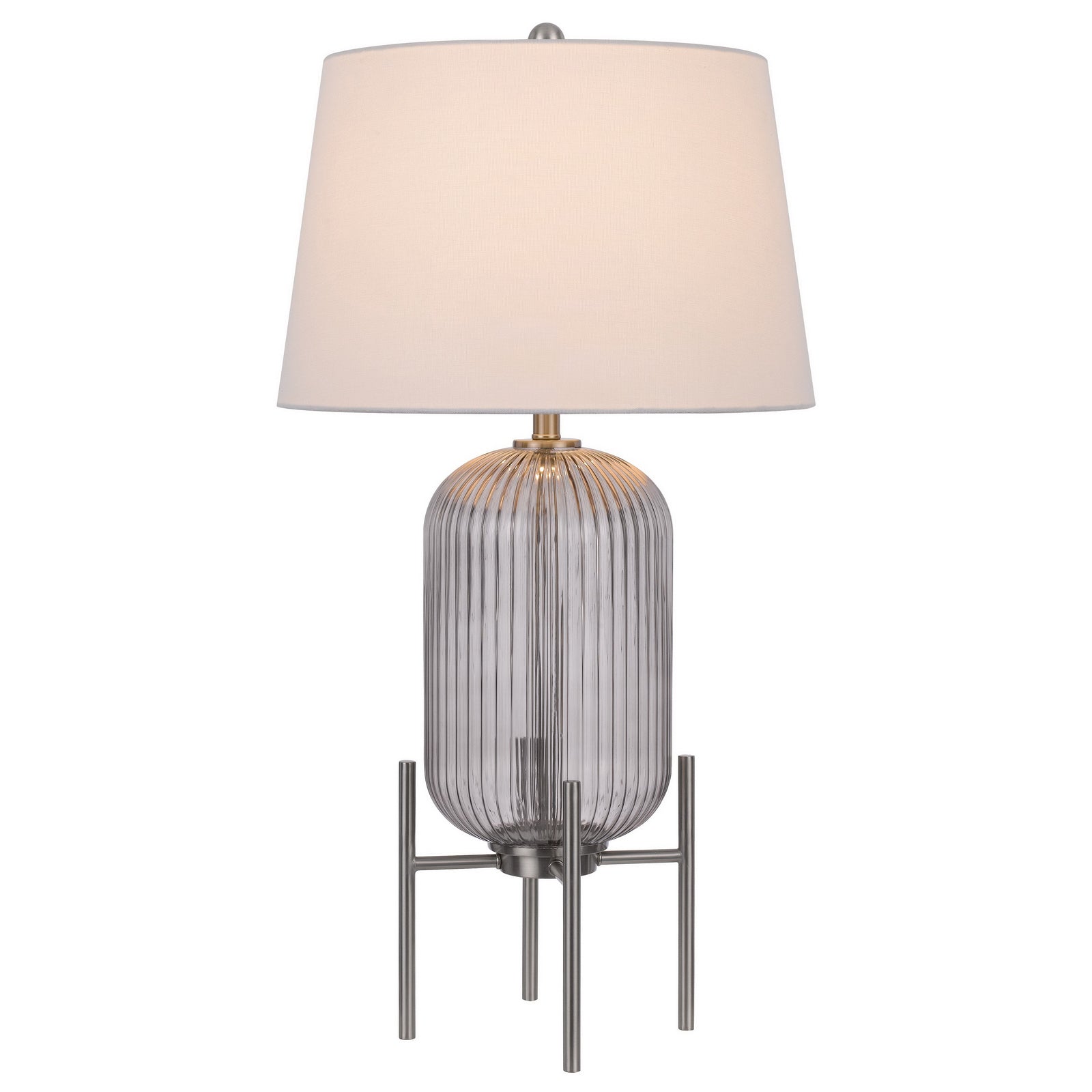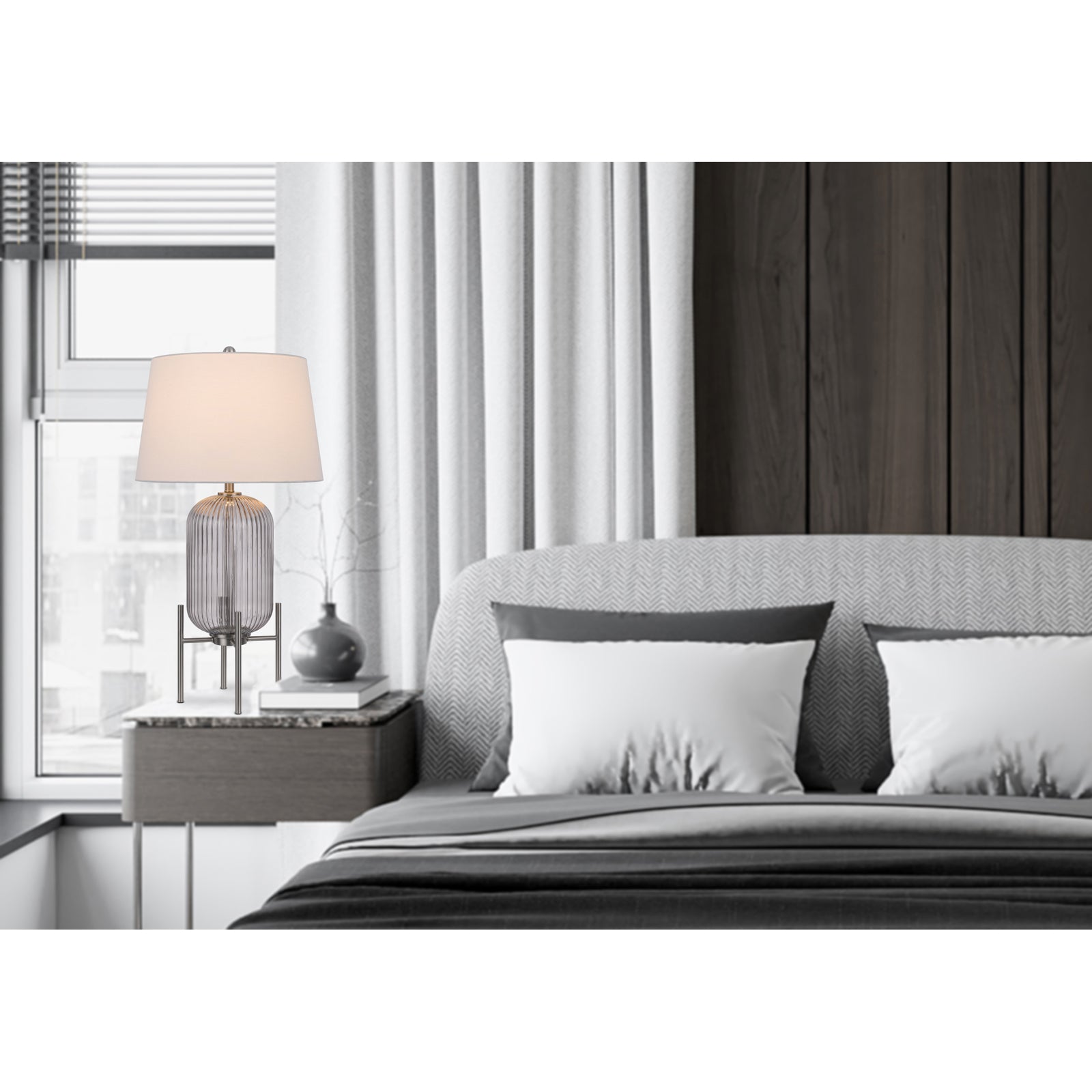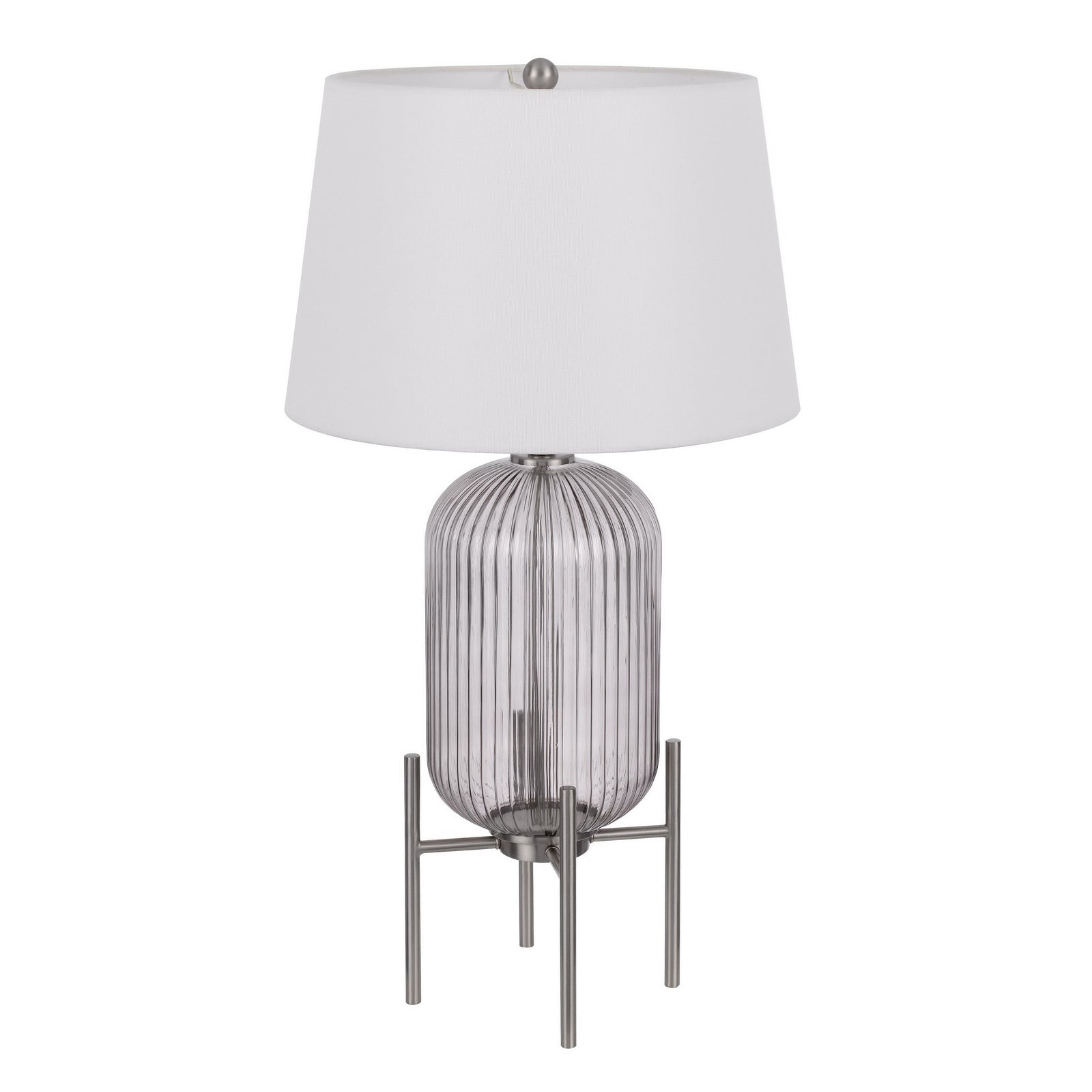 The BO-3047TB 150W 3-way Belleville fluted glass table lamp is an ideal lighting choice for a range of spaces, from modern to contemporary to industrial. Constructed from durable metal and glass, this lamp features a brushed steel metal stand and a clear glass fluted body, complemented by a hardback fabric shade. It utilizes a three-way switch for versatile lighting options and requires one E26 base bulb (not included). With package dimensions of 18.30\