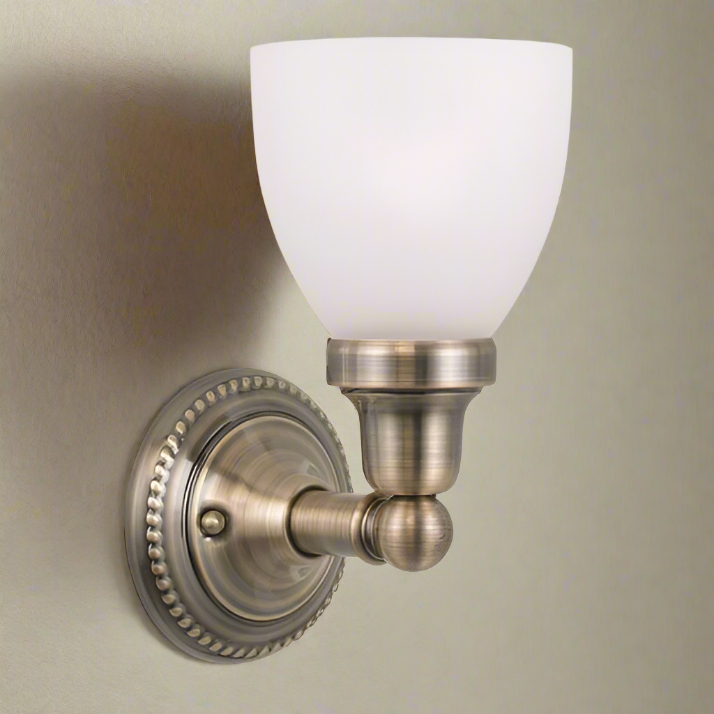 The 1021-01 Classic Bath Vanity Fixture in Antique Brass is a perfect addition for those desiring a traditional lighting element in their bathroom. This one-light torchiere fixture features a 6-inch width and a height of 10 inches, with a 6.5-inch extension, making it an ideal fit for spaces of various sizes. It is topped with a Satin Opal White glass shade, providing a clean and classic aesthetic. This fixture requires a medium base bulb (not included) with a maximum wattage of 100W, and it is suitable for damp locations, ensuring usability in humid areas.
