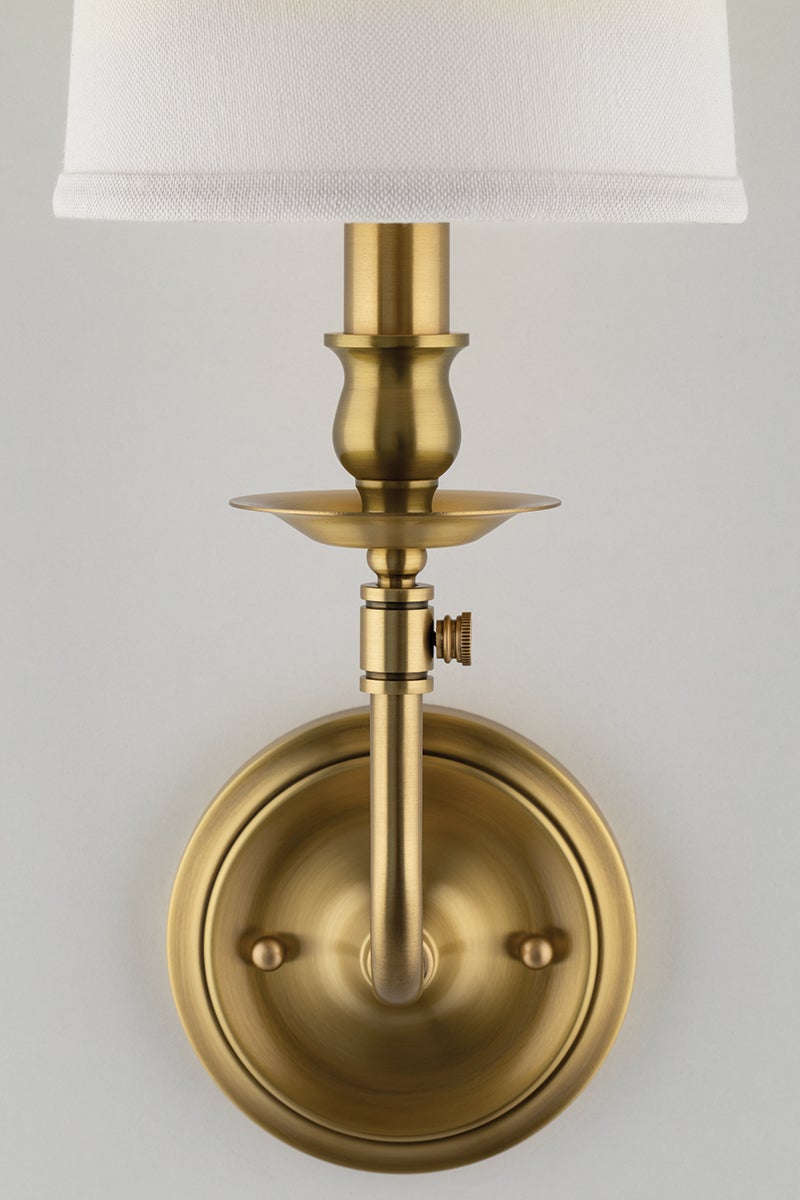 The Logan Wall Sconce by Hudson Valley Lighting combines elegance and functionality, making it a superb addition to any space. With its off-white linen shade, it diffuses soft light beautifully and requires one E12 candelabra base bulb (not included) with a maximum wattage of 60W. The fixture measures 6.25 inches in width, 18 inches in height, and extends 7 inches from the wall, while the top of the shade sits 15.5 inches from the center. Available in finish options such as Aged Brass, Old Bronze, and Polished Nickel, this sconce is UL Damp rated, suitable for humid environments, adding both ambiance and style.