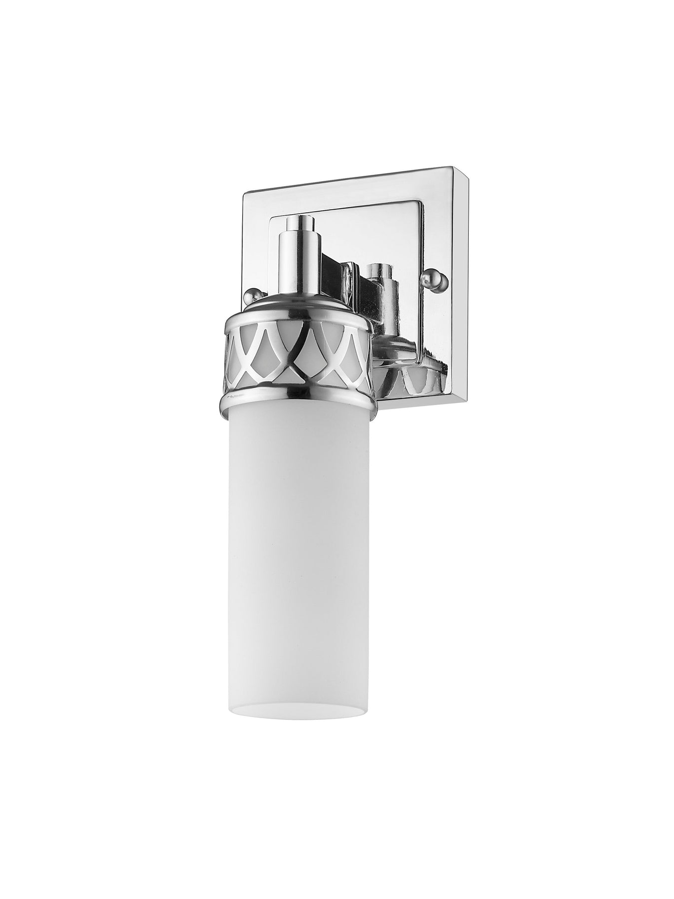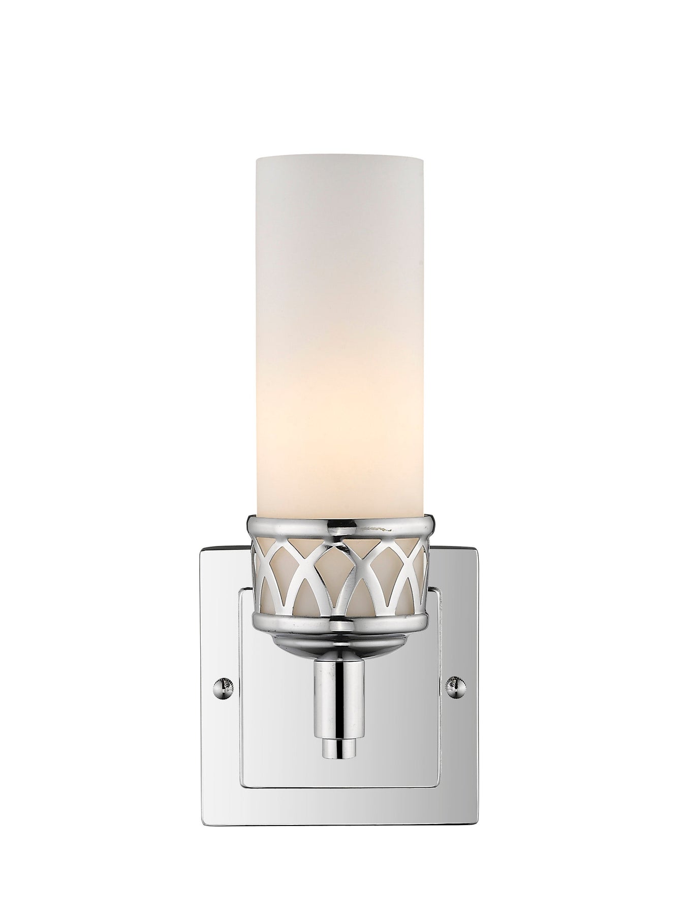 The 4721-05 Westfield Bath Vanity fixture boasts a sleek and contemporary design, featuring a smooth, cylindrical, hand-blown satin opal white glass shade that adds a discerning touch to your space. This stylish fixture is anchored by a classic squared backplate and is finished in polished chrome, making it a versatile fit for both contemporary and traditional decor. It measures 4.5 inches in width, 10.75 inches in height, and has an extension of 4 inches. Designed for one candelabra base bulb (not included) with a maximum wattage of 60W, this fixture is suitable for damp locations, providing a perfect lighting solution for bathrooms.