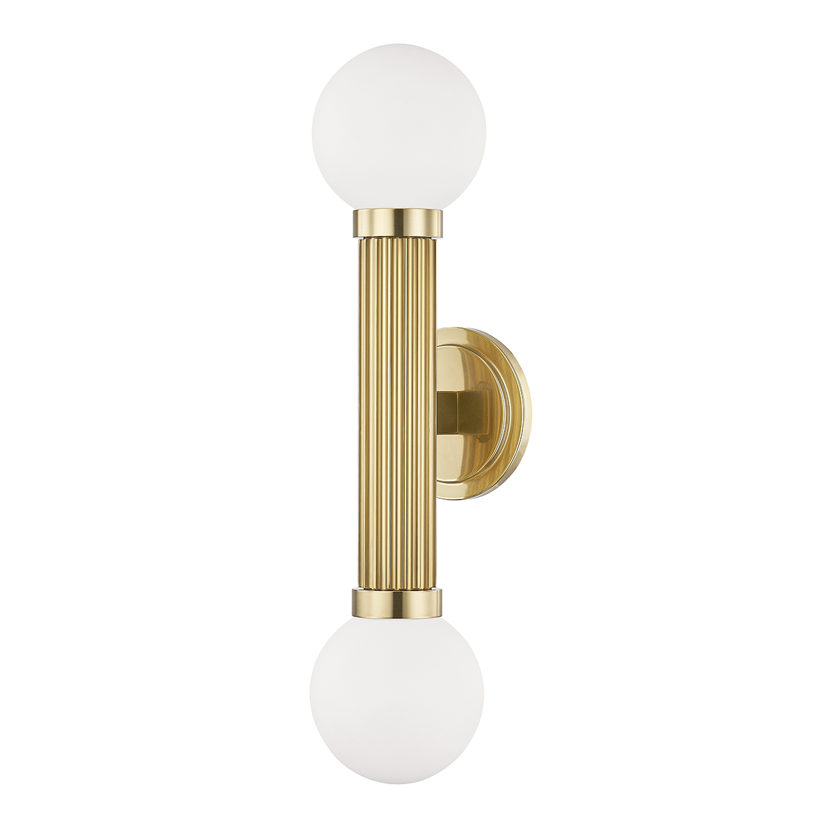 The Reade Wall Sconce by Hudson Valley Lighting is a striking addition to any space, featuring an elegant design in your choice of Aged Brass or Old Bronze finishes. This sconce accommodates two E26 medium base bulbs with a recommended maximum wattage of 8W each, making it a versatile and energy-efficient lighting option. It has a width of 5.00 inches, a height of 21.75 inches, and an extension of 5.75 inches, with a top-to-center measurement of 10.25 inches. Designed with UL Damp rating, this fixture is perfect for use in bathrooms and other humid environments.