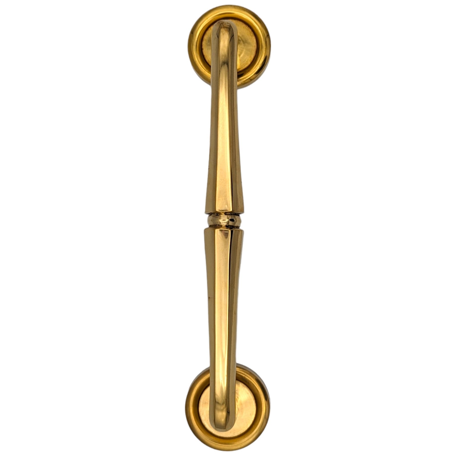 This oversize Madison pull has an overall measurement of 10 inches with a center to center measurement of 8 inches. Crafted from solid brass and hand finished, each pull in our collection is solid brass, ensuring a tangible sense of quality and meticulous craftsmanship. Each pull comes with bolts for installation.