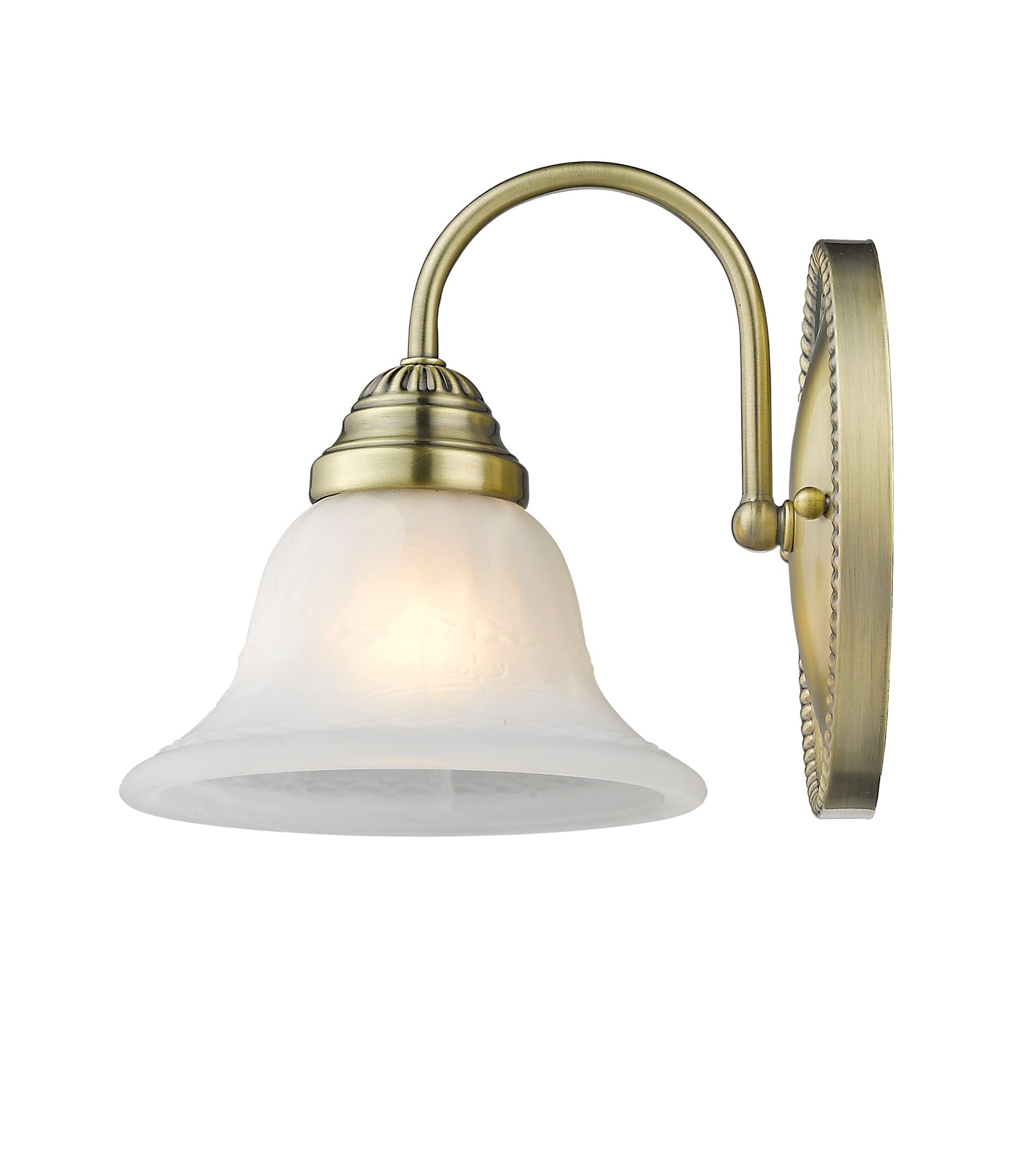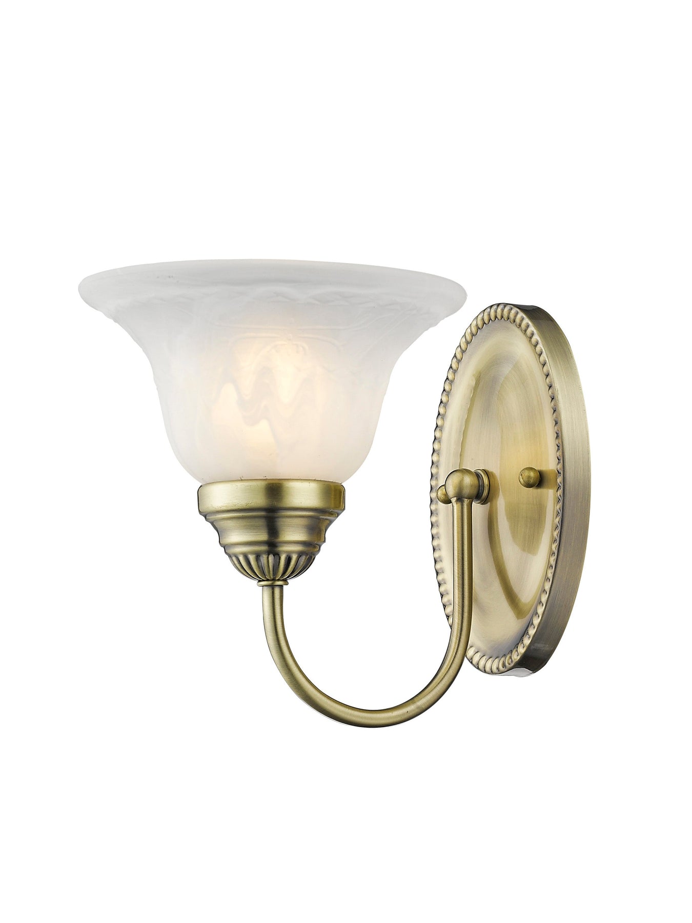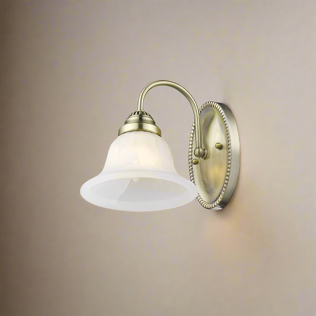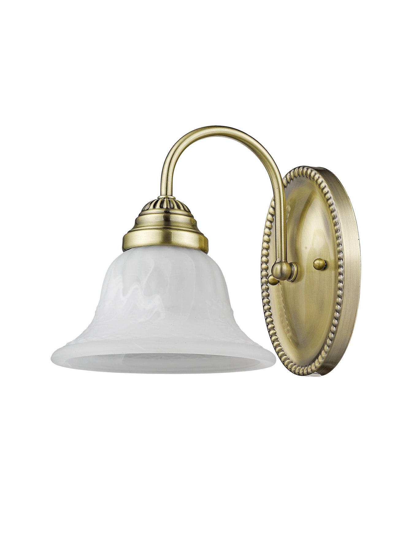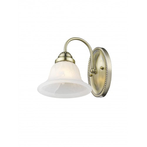 The Edgemont Wall Sconce, item number 1531-01, is a sophisticated lighting fixture designed for traditional aesthetics. This one-light bath vanity sconce features an elegant antique brass finish and a beautiful white alabaster glass shade. With dimensions of 7 inches in width and 8 inches in height, it has an 8.75-inch extension, making it suitable for various wall applications. It accommodates a single medium base bulb (not included) with a maximum wattage of 100W and is designed for uplight/downlight versatility. UL listed for damp locations, this sconce is ideal for bathrooms, adding a touch of classic charm to your space.