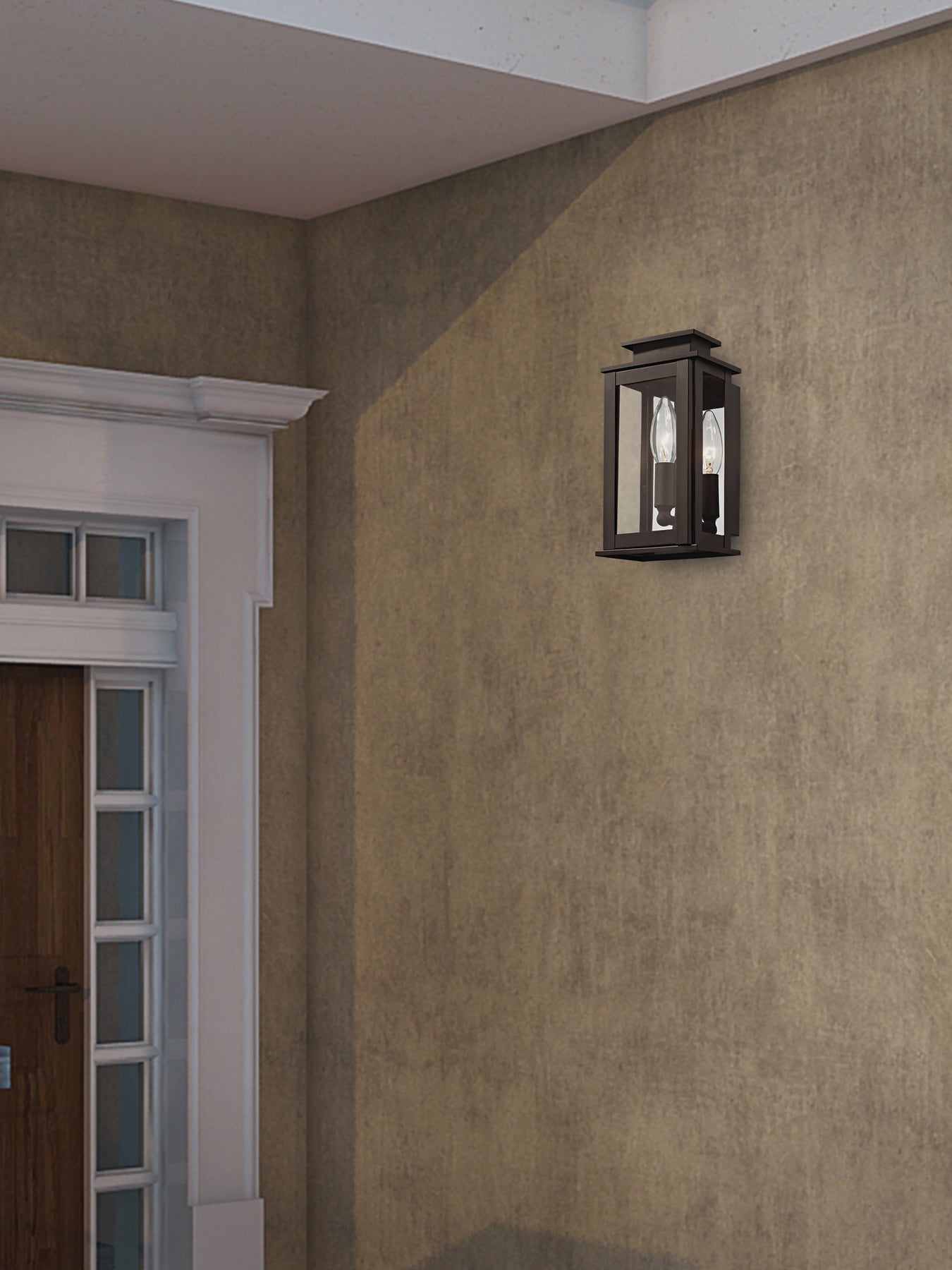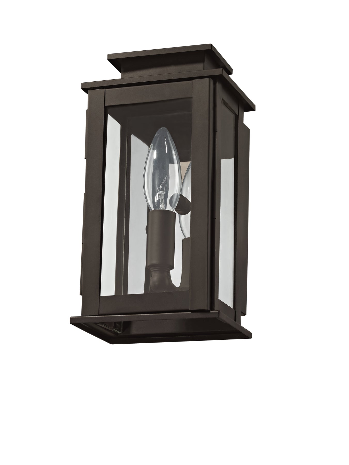 The 20191-07 Princeton Wall Lantern is a superb choice for adding a touch of traditional elegance to your outdoor spaces. Handcrafted from solid brass, this stunning fixture features a beautiful bronze finish and clear glass, showcasing its old-world charm. Measuring 4.75 inches in width and 9 inches in height, with an extension of 3.875 inches, it accommodates one candelabra base bulb (not included) with a maximum wattage of 60W. Designed for durability, this fixture is suitable for both damp and wet locations, making it perfect for any outdoor setting.