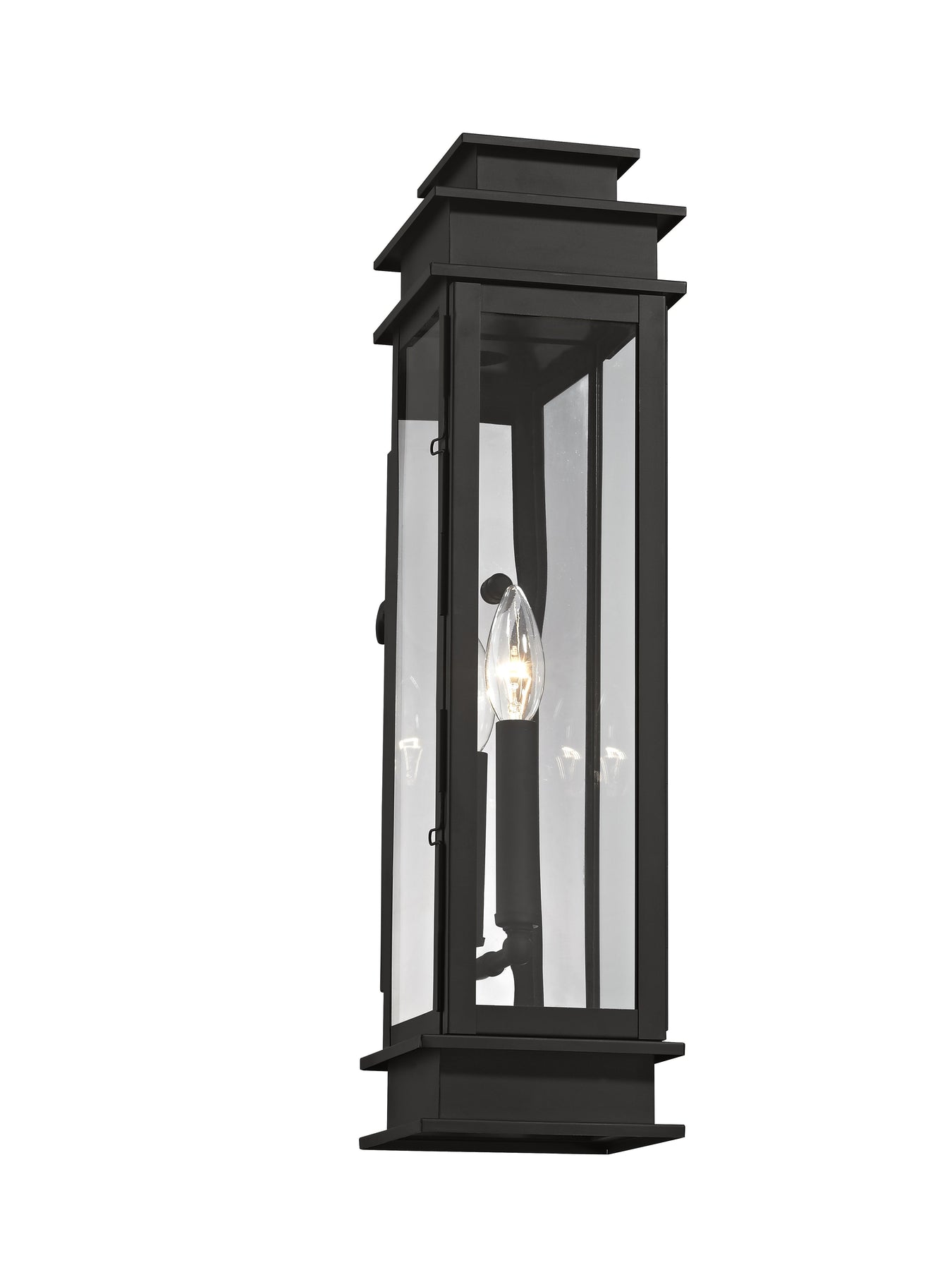 The 20207-04 Princeton Wall Lantern is a stunning blend of traditional design and modern durability. Handcrafted from solid brass, this outdoor fixture boasts a timeless black finish complemented by clear glass, creating an inviting ambiance. It measures 5.25 inches in width and 20.25 inches in height, extending 6 inches from the wall. The sconce requires one candelabra base bulb (not included) with a maximum wattage of 60W. Built to withstand the elements, it is suitable for both damp and wet locations, making it an ideal choice for outdoor spaces.