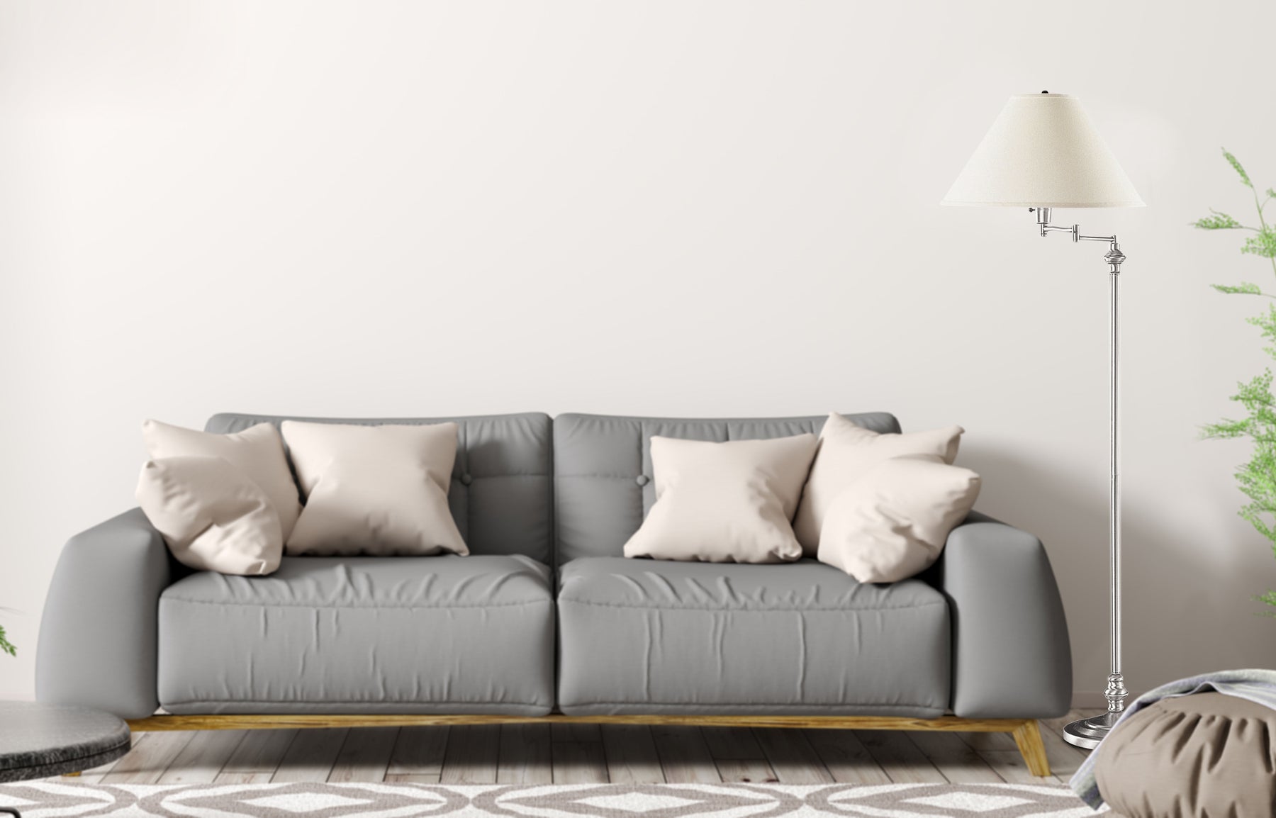 The BO-314-BS 150W 3 Way Swing Arm Floor Lamp is a versatile and stylish addition to any room, featuring durable metal construction and a beautiful brushed steel finish. Its fully functional swing arm allows for adjustable lighting, while the included matching hardback fabric shade enhances its aesthetic appeal. Standing at 59 inches tall, this floor lamp requires little to no assembly and uses an E26 bulb base for easy replacement. The three-way switch offers customizable brightness options, making it perfect for reading or ambient lighting in various settings.