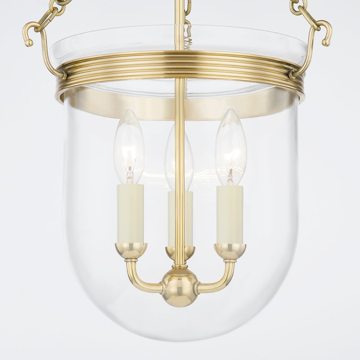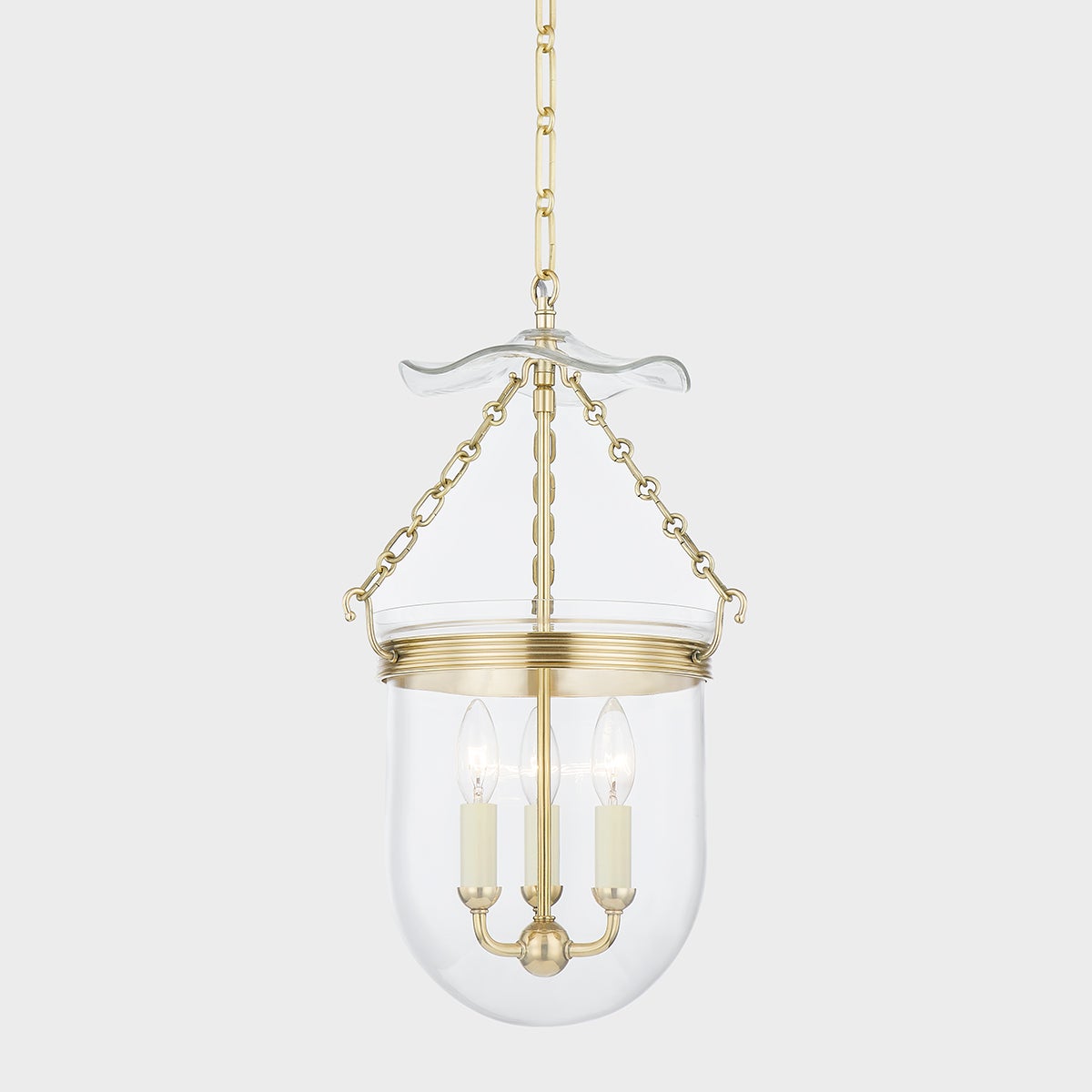 Rousham modernizes the traditional bell jar design with flowing lines and clean details such as ribbed metal banding and a stately chain, both in Aged Brass. The graceful, flowing glass that sits atop the pendant is a simple accent that draws the eye and makes the piece stand out. Part of our Mark D. Sikes collection.