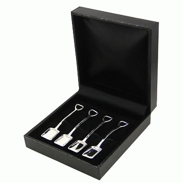 Set of 4 Tiffany Style Shovel Salt Spoon - each measures nearly 2 1/2 inches (64 mm) long. Hallmarked 925 for sterling silver. Comes in a black hinged gift box.