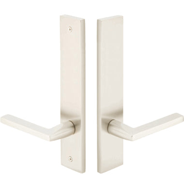 Solid Brass Modern Style Dummy Pair Multi Point Lock Trim (Brushed Nickel Finish) - The multi point lock trim displayed here includes a smooth brushed nickel finish. Measures 2 inches wide by 10 inches tall. Sold as a complete set, which includes plates, handles and cylinder. Multi point mortise lock box is not included. Trims only.