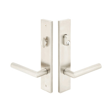 Stainless Steel Keyed Style Multi Point Lock Trim (Brushed Stainless Steel Finish) - The Emtek swinging patio door hardware pictured here includes a fine brushed stainless steel coating. Measures 2 inches wide by 10 inches tall with a 4 1/8 inch center to center hole spacing. Sold as a complete set, which includes plates, handles and cylinder. Multi point mortise lock box is not included. Trims only.