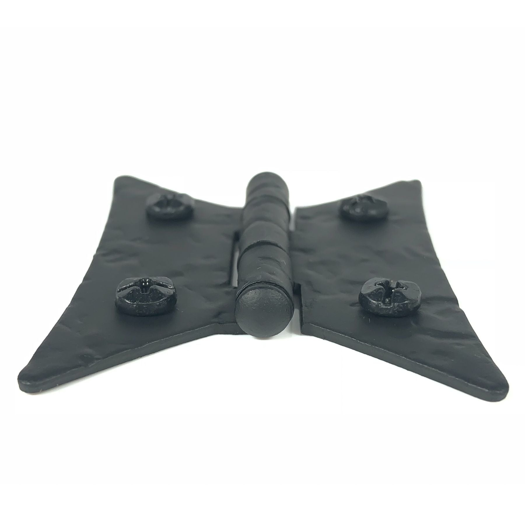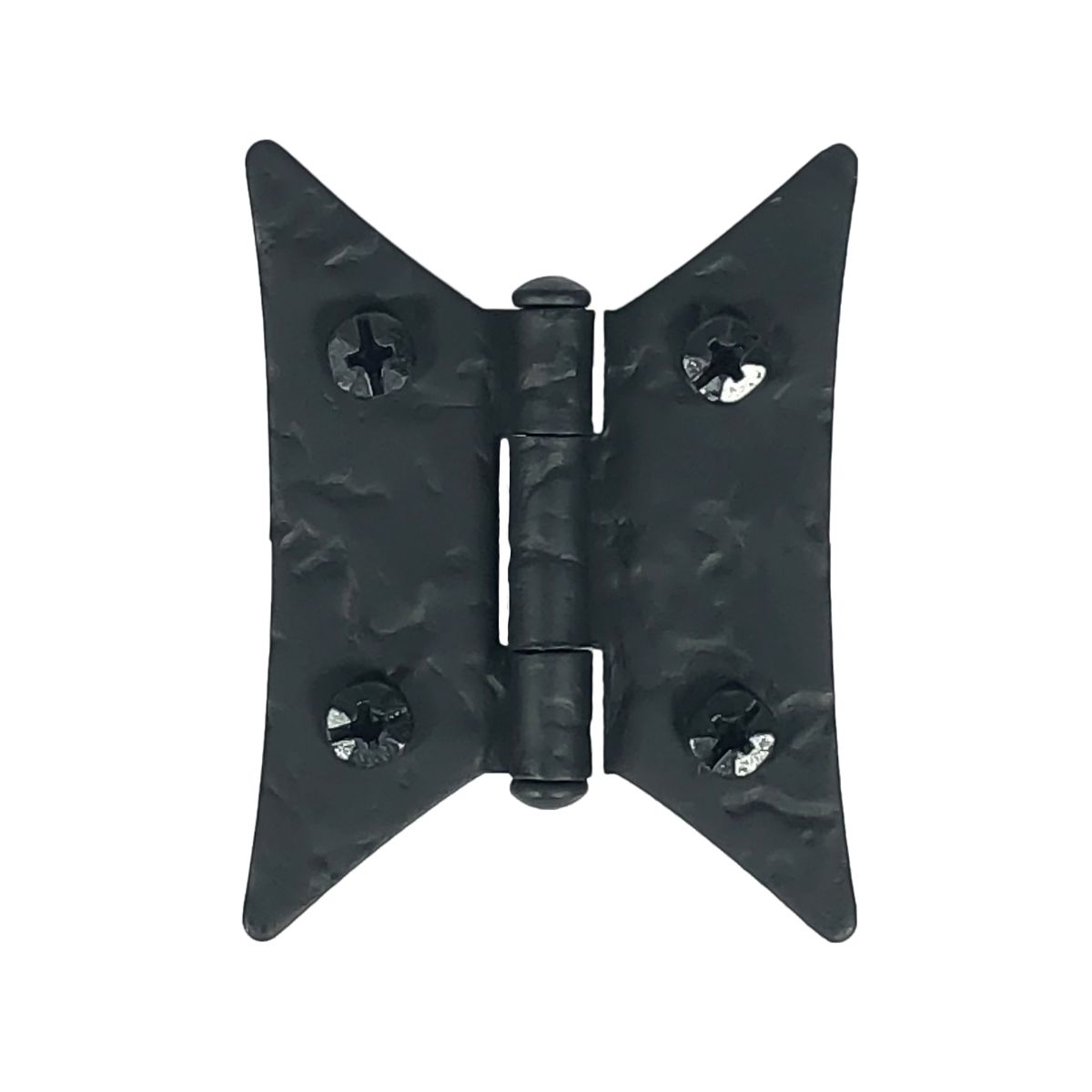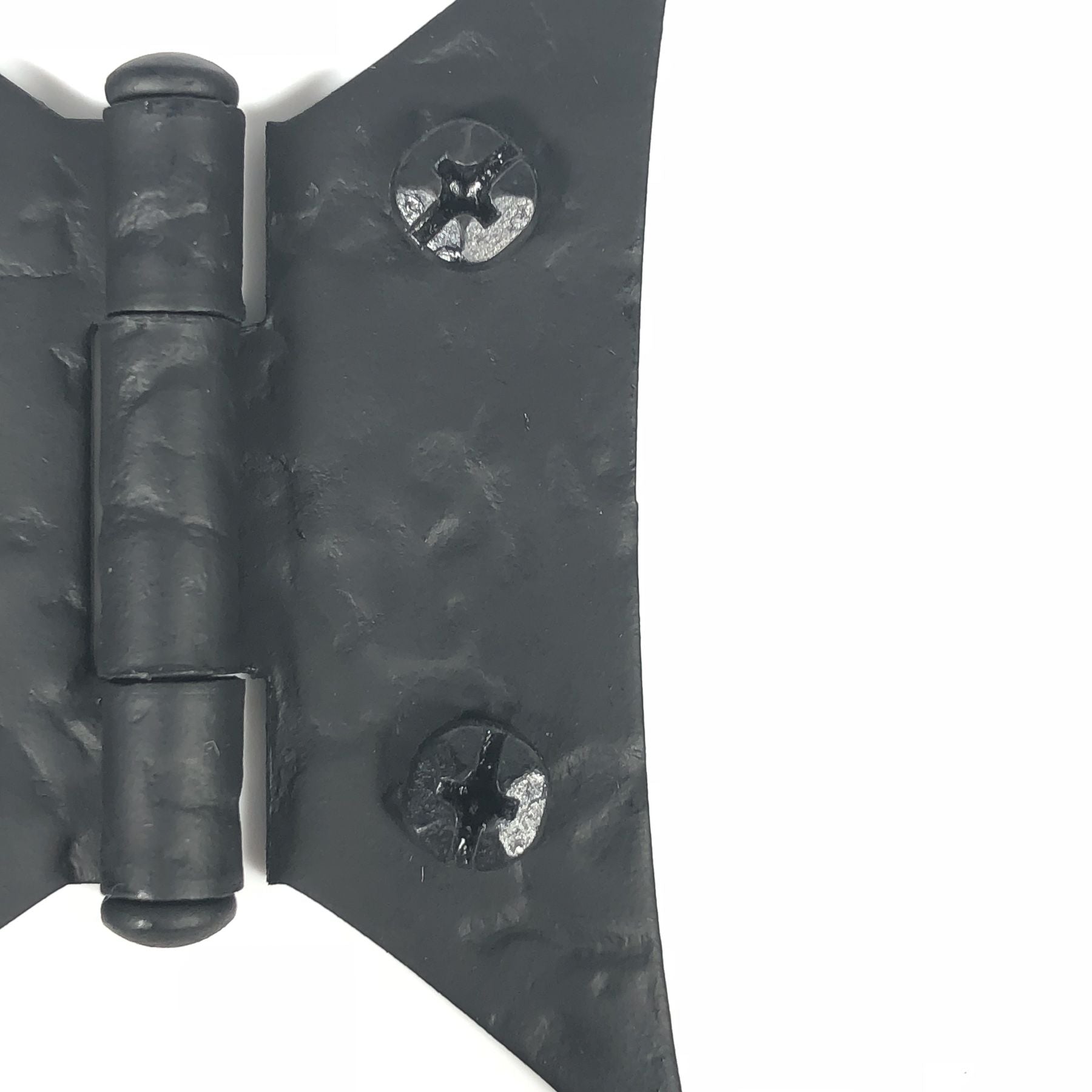 Sold in pairs - solid cast iron Butterfly door hinges - rough iron in a black matte finish. These hinges measure 2 5/8 inches tall (67 mm) by 2 inches (51 mm). These have a 3/8 inch offset (10 mm). The pair of hinges come complete with the mounting hardware.