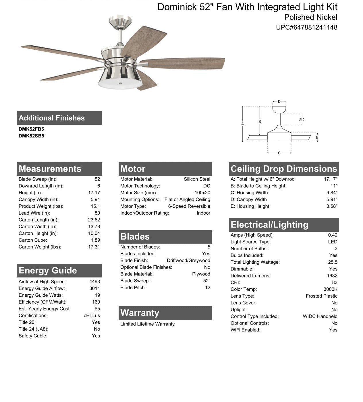 The Dominick 52" Smart ceiling fan is the perfect combination of contemporary mid-century modern style and exceptional performance. The Dominick 52" fan with the quiet energy saving 6-speed, reversible DC motor, set of five reversible custom blades and sleek integrated dimmable LED flared dome light with frosted white diffuser is easily controlled with either the included remote controls or the integrated Wi-Fi featuring breeze and timer functions compatible for use with most smart home devices, smart phones and systems with no additional hub needed.