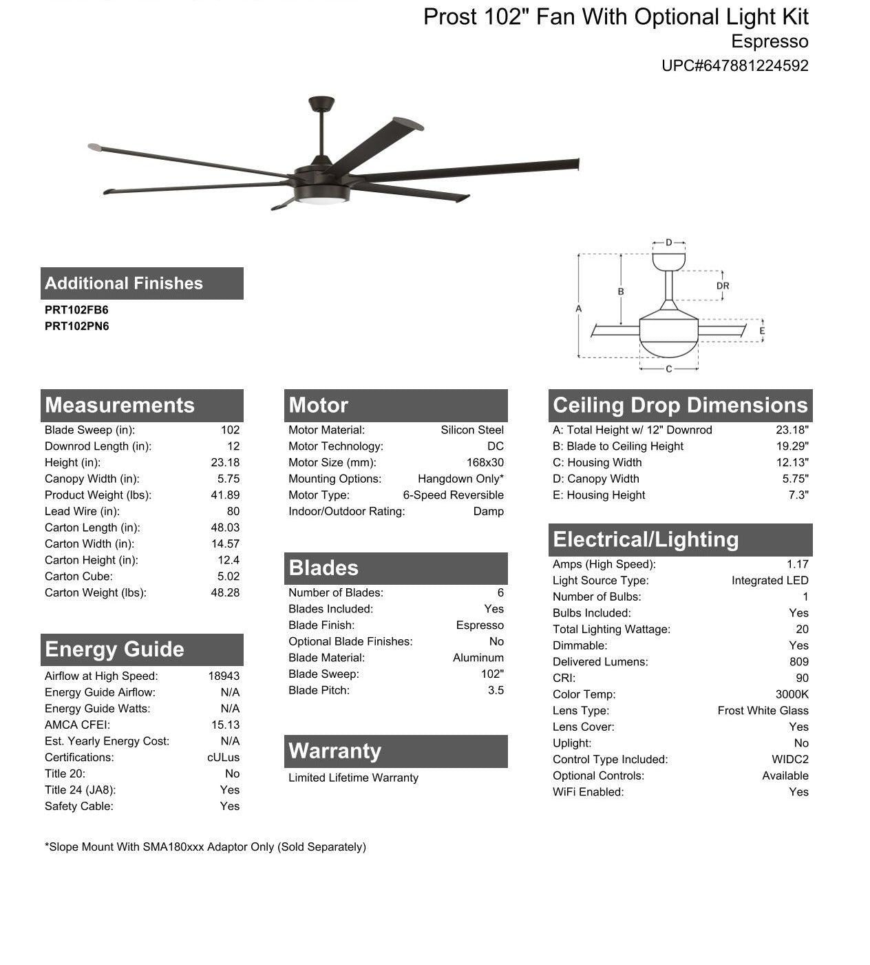 - Downrod Mount(Flat Ceiling) unless SMA180 slope adapter is used; Slope Mount with SMA180XXX adapter only-Sold Separately