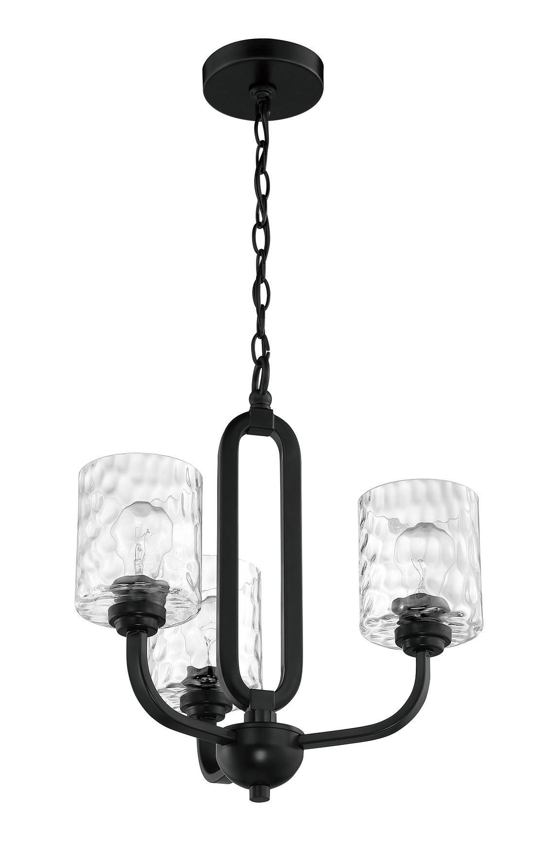 The Collins 3 Light Chandelier in Flat Black combines elegance and functionality, perfect for enhancing your indoor space. This chandelier features a striking design with graceful geometric elements and clear hammered glass shades, providing a warm, inviting glow. It is suspended by a 6FT chain and is rated for indoor use. The fixture requires three medium base 60 watt bulbs (not included) and includes a dimensions of 17.50 inches in depth, 17.50 inches in width, and a height of 18.75 inches. With a unique canopy design measuring 5.12 inches in width and length, it adds a sophisticated touch to any room.