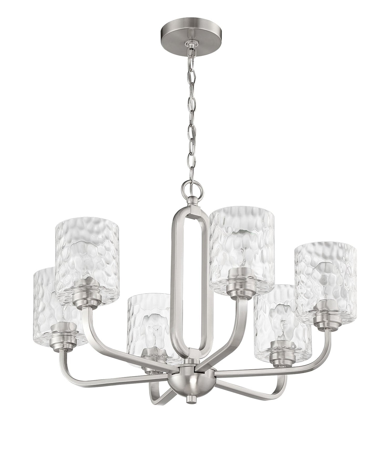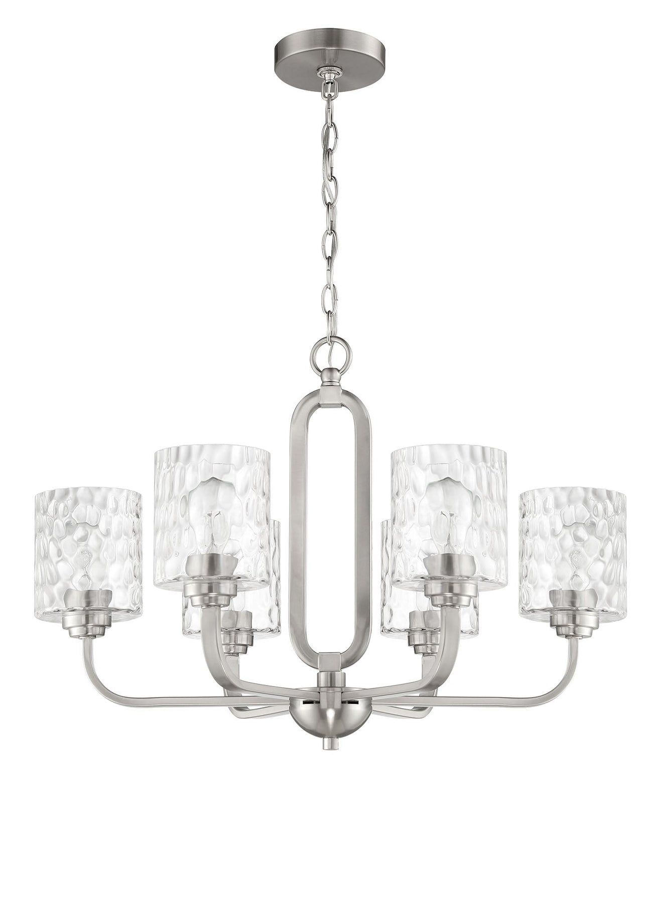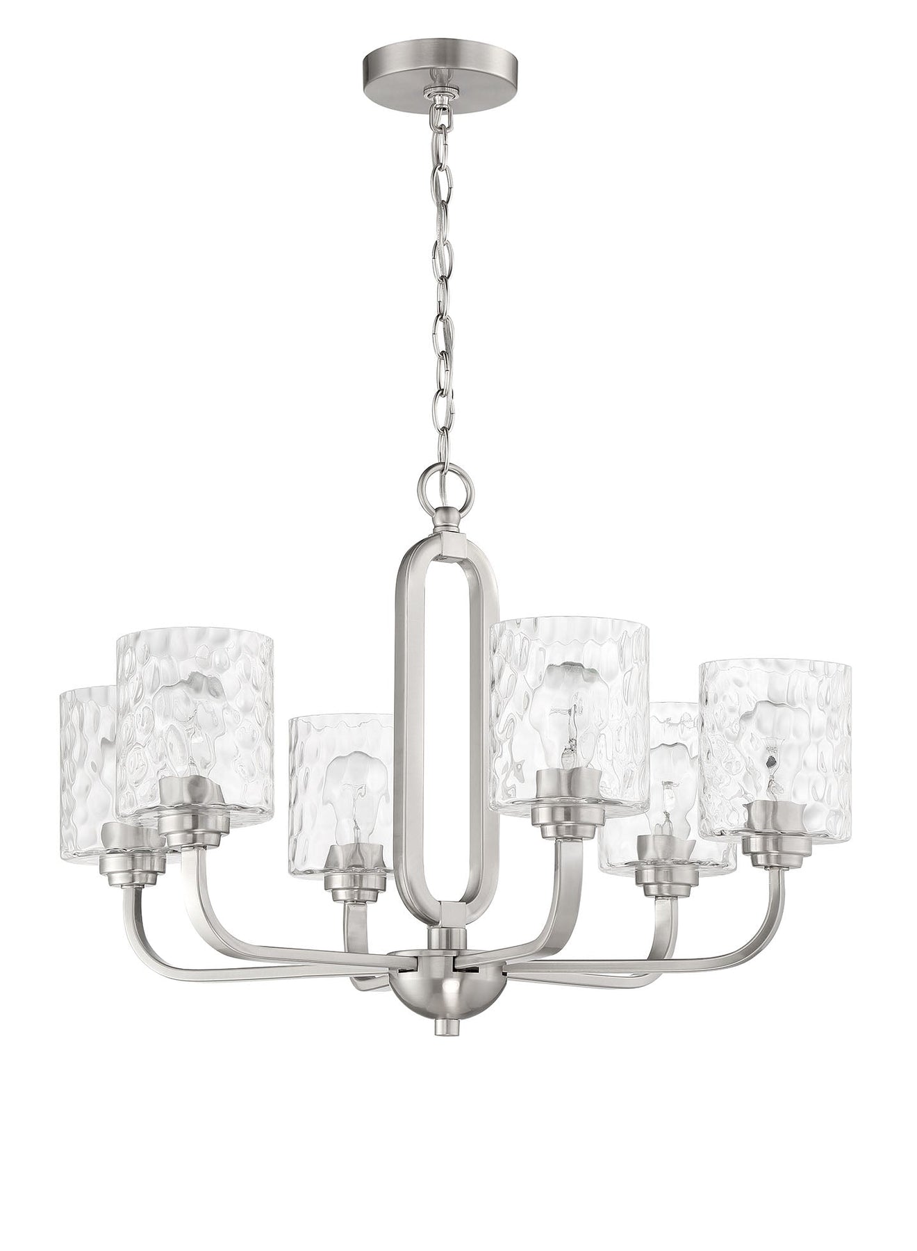The Collins 6 Light Chandelier in Brushed Polished Nickel offers a captivating blend of style and functionality, ideal for enhancing any indoor space. This chandelier requires six medium base A19 bulbs, each with a maximum wattage of 60W (not included), and features elegant hammered glass shades that diffuse light beautifully. With dimensions of 26 inches in width, 26 inches in depth, and 18.75 inches in height, it is designed to make a statement. The chandelier is equipped with a 6-foot chain for versatile hanging options and is supported by a sturdy canopy measuring 5.12 inches wide. Additionally, it comes with a one-year limited warranty for peace of mind and meets safety standards with a cULus rating.