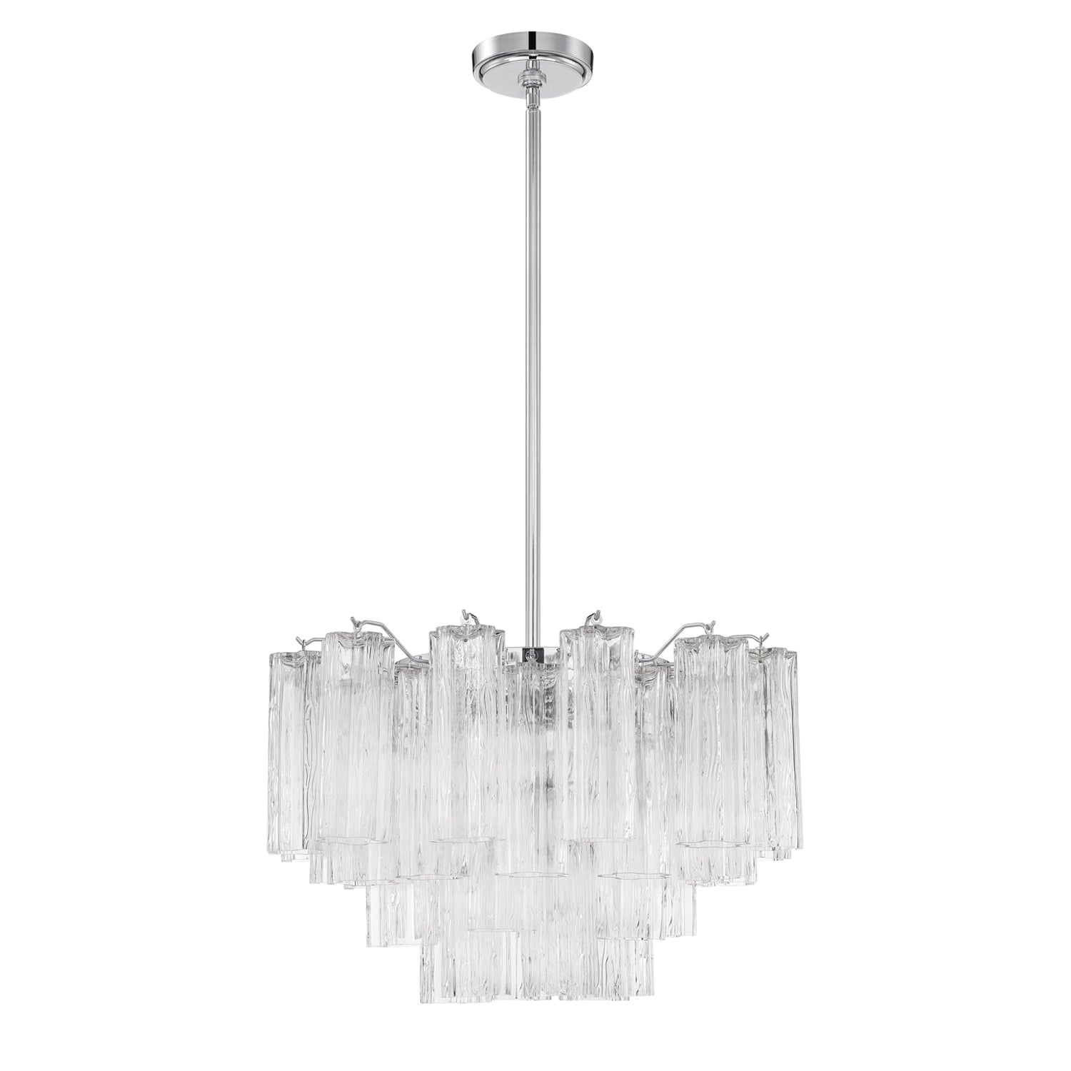 The captivating Addis Lighting Collection is a modern-day interpretation of the iconic mid-century Tronchi chandelier. Inspired by its predecessor's sleek lines and geometric shapes, the Addis features a polished Chrome or Aged Brass metal frame that exudes sophistication and style. Its unique design showcases transparent tiers of textured Tronchi glass tubes, forming a mesmerizing 5-point rounded star shape. Choose from a range of glass colors, including clear, amber, smoke, and white, or the stunning Autumn option, which features a captivating multicolor disposition of amber, clear, and smoke Tronchi glass. The Addis Lighting Collection offers various sizes and finishes, allowing you to find the perfect fit for your space while adding a touch of timeless elegance.