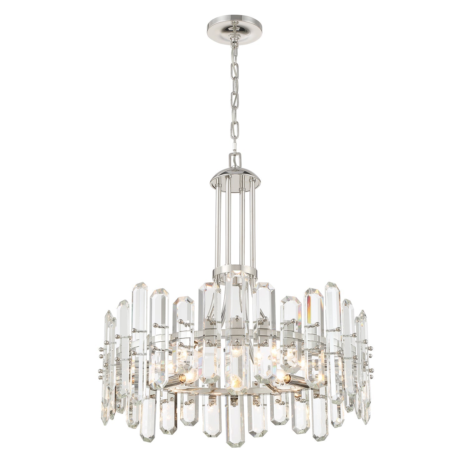 The Bolton Collection exudes glamour and luxury when placed as a focal point in the room. The varying sized faceted cut crystal panels are secured to a floating steel frame. The unique crystal prisms reflect beautiful light that creates an endless sparkle that elegantly blend with many home décor styles.