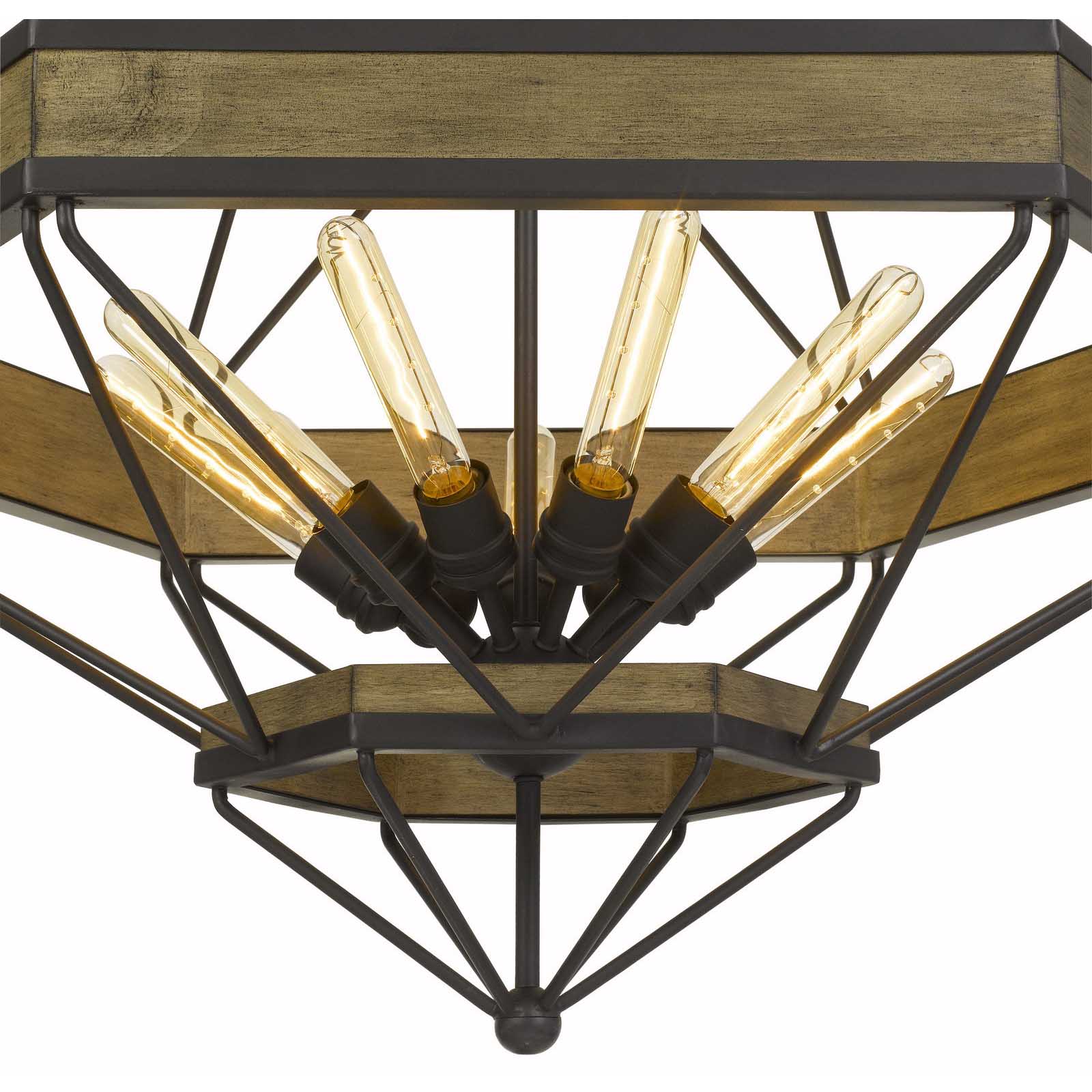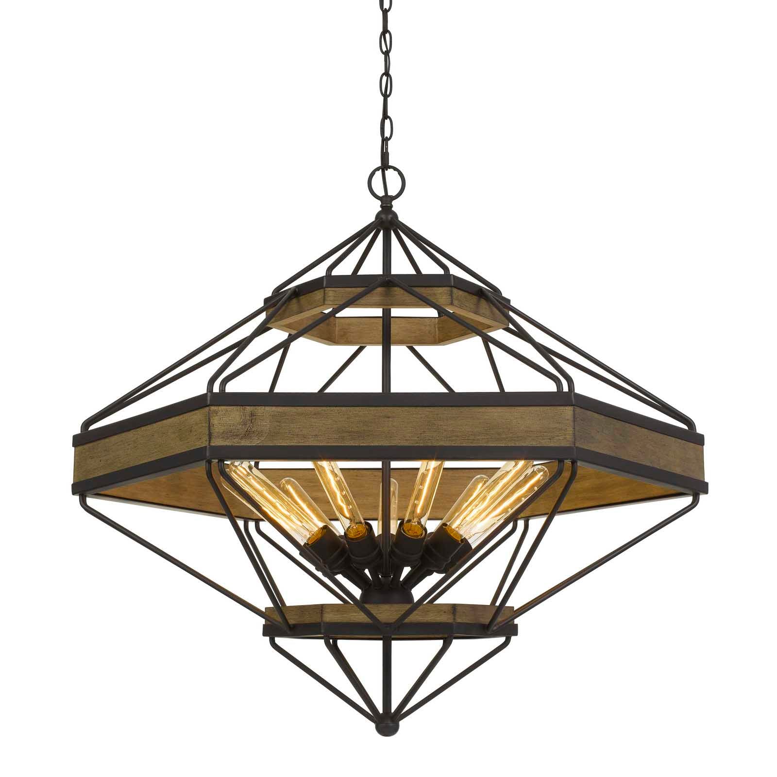 The Alicante 60W X 9 Pine Wood/Metal Chandelier (Product No. FX-3702-9) is a stunning addition to any space, featuring a durable pine wood construction combined with a sleek metal finish in wood and black. This chandelier showcases a three-tier hexagon design, perfect for creating a warm ambiance with uplighting. It accommodates 9 bulbs with a maximum wattage of 60W each (Edison bulbs not included) and is suspended by a 6-foot chain. The fixture stands at 33.5 inches tall and ships conveniently in one carton. With assembly required, it also comes with a one-year warranty, ensuring long-lasting quality and performance.