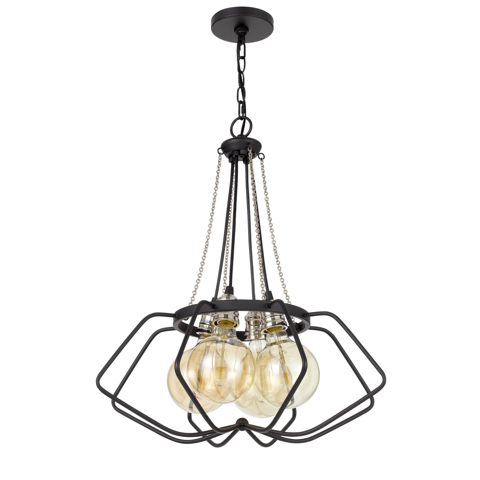 The FX-3750-4 Ladue metal chandelier is a stunning addition for those looking to enhance their modern decor. Featuring four E26 bulbs (Edison bulbs included), this chandelier offers a maximum wattage of 60W per bulb, ensuring ample illumination. Its open wrought iron frame in an elegant black finish gives it a striking two-tone appearance. This chandelier comes with a generous 10 ft hanging wire and a 6 ft chain for adjustable installation. Minor assembly is required, and it is backed by a one-year warranty, ensuring quality and durability.