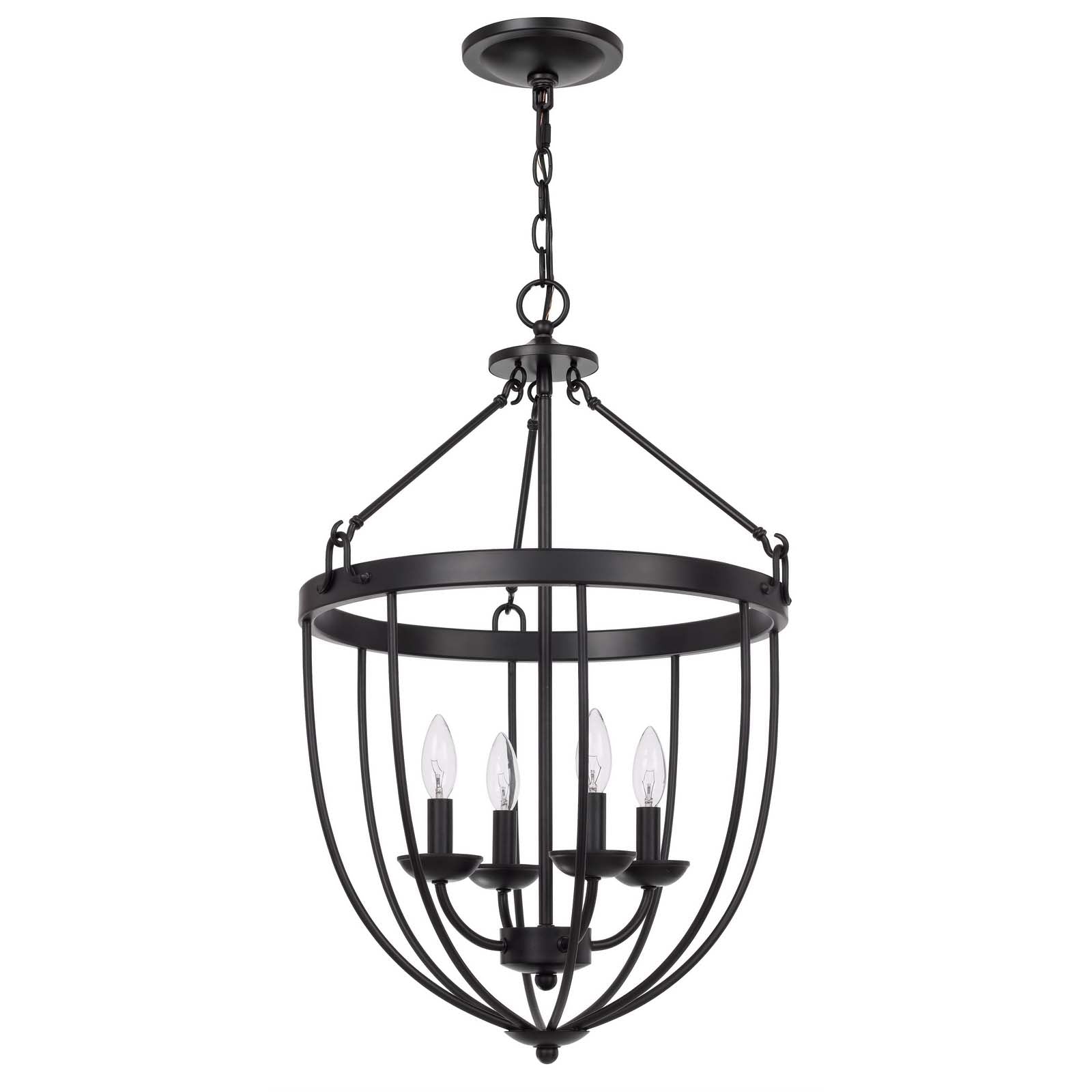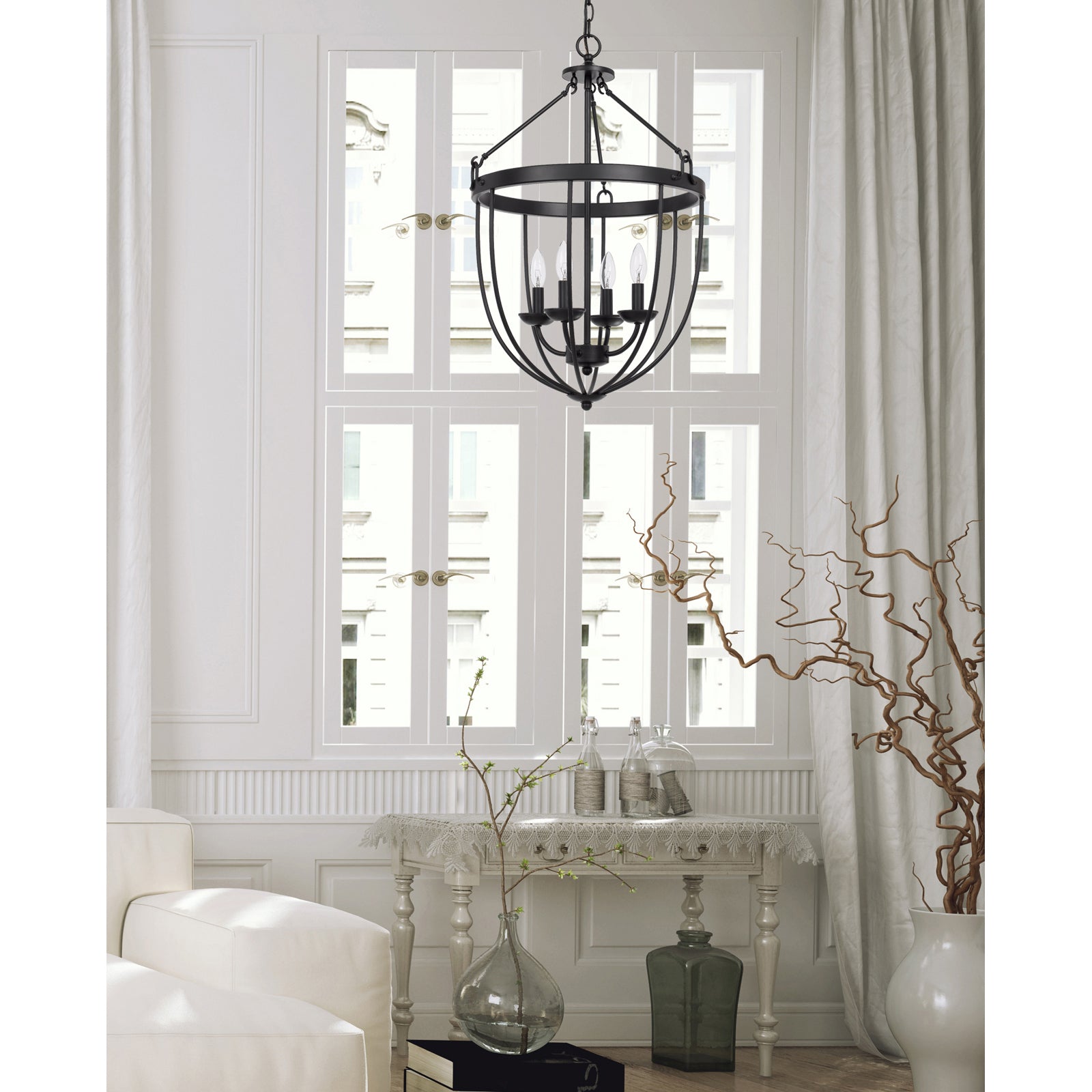 The FX-3762-4 Grafton Metal Chandelier is a stunning centerpiece that combines rustic charm with contemporary design. Featuring a unique pendulum design and a bird cage aesthetic, this chandelier is crafted from heavy gauge metal and finished in a hand-applied matte black for a smooth, elegant look. It accommodates four candelabra bulbs (not included) with a maximum wattage of 60W each, making it perfect for illuminating dining room tables. With dimensions of 28 1/2 inches in height, this chandelier not only makes a bold statement but also offers durability with a one-year warranty against defects in material and workmanship.