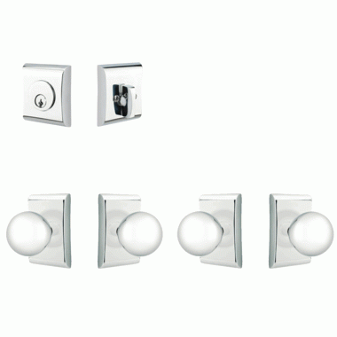 Emtek Single Door Entryway Orb Knob With Neos Rosette (Polished Chrome Finish) - this entryway set measures 2 1/2 inches wide. The deadbolt plate measures 2 3/4 inches tall, and the door plate measures 4 5/8 inches tall. Various styles of knobs available at no additional charge. Entryway backset comes as 2 3/8 inch standard and a 2 3/4 inch backset is available if required. The overall grip thickness is 1 1/16 inch. The clearance between the door and grip is 1- 1 3/8 inches. The plates have a thickness of 7/16 inch. This is a complete set and it comes with tubular latch mechanisms, strike plates, complete knob sets, internal mechanisms, deadbolts and all mounting hardware.