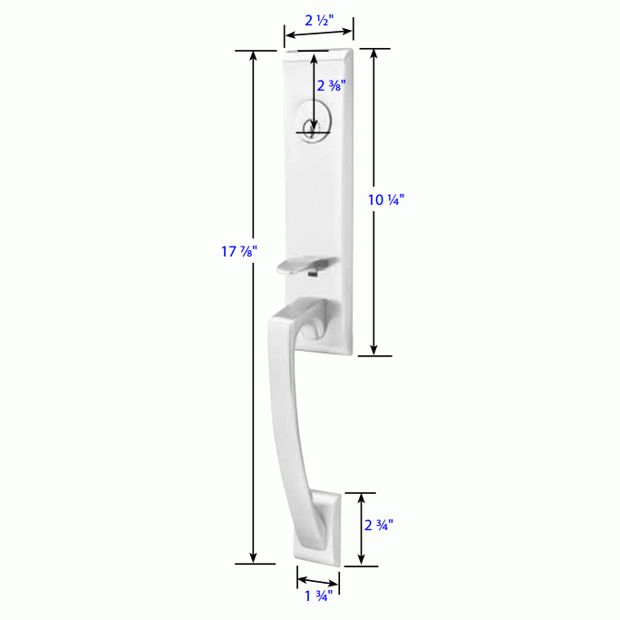 Solid Brass Apollo Style Entryway Set (Brushed Nickel Finish) - this entryway set measures 2 1/2 inch wide by 17 7/8 inch tall. Various styles of knobs available at no additional charge. Entryway set deadbolt to knob center-to-center distance is 5 1/2 inches. Entryway backset comes as 2 3/8 inch standard and a 2 3/4 inch backset is available if required. The overall grip thickness is 1 inch. The clearance between the door and grip is 2 1/4 inches. The plates have a thickness of 1/2 inch. This is a complete set and it comes with tubular latch mechanisms, strike plates, complete knob sets, internal mechanisms, deadbolts and all mounting hardware.