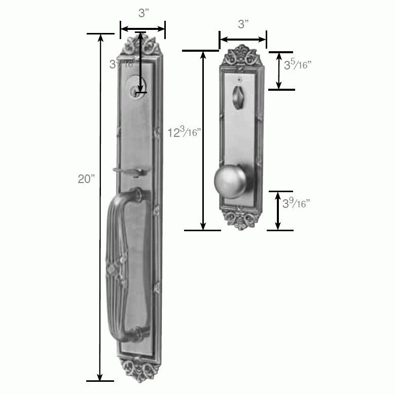 Solid Brass Imperial Style Entryway Set - this entryway set measures 3 inch wide by 20 inch tall. Various styles of knobs available at no additional charge. Entryway set deadbolt to knob center-to-center distance is 5 1/2 inches. Entryway backset comes as 2 3/8 inch standard and a 2 3/4 inch backset is available if required. The overall grip thickness is 1 5/16 inch. The clearance between the door and grip is 1 9/16 inches. The plates have a thickness of 1/2 inch. This is a complete set and it comes with tubular latch mechanisms, strike plates, complete knob sets, internal mechanisms, deadbolts and all mounting hardware.