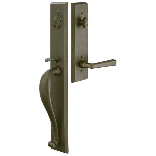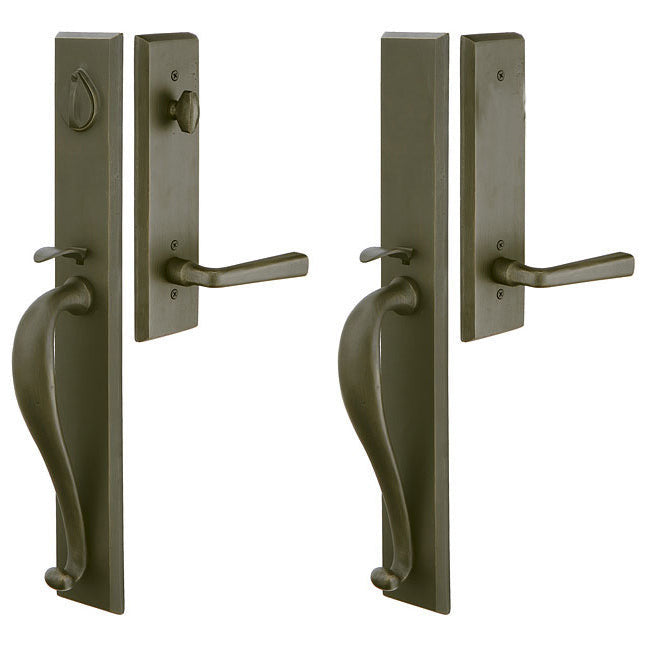 Solid Brass Rectangular Full Length Style Entryway Set (Medium Bronze Finish) - this entryway set measures 2 1/4 inch wide by 19 inch tall. Various styles of knobs available at no additional charge. Entryway set deadbolt to knob center-to-center distance is 5 1/2 inches. Standard door thickness is 1 3/4 inch, specify if thicker. Locks for in-swing doors are standard, for out-swing doors please specify. Entryway backset comes as 2 3/8 inch standard and a 2 3/4 inch backset is available if required. The overall grip thickness is 1 11/16 inch. The clearance between the door and grip is 1 7/8 inches. The plates have a thickness of 1/2 inch. This is a complete set and it comes with tubular latch mechanisms, strike plates, complete knob sets, internal mechanisms, deadbolts and all mounting hardware.