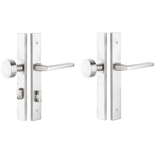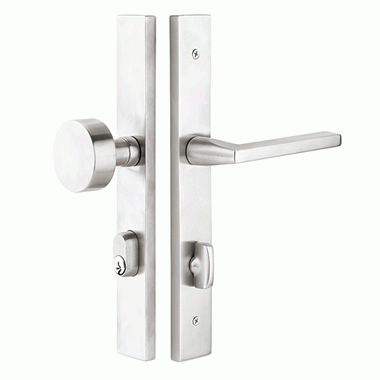 Stainless Steel Stretto Style Passage Entryway Set - The EmTek entryway set shown here includes a gorgeous stainless steel coating and a stretto style design. Measures 1 1/2 inches wide by 11 inches tall. Includes a 3 3/8 inch center to center hole spacing with narrow 1 1/4 inch door preps. A 28 degree latch is available in 2 3/8 inch backsets. Please specify if a 2 3/4 inch backset is required. Sold as a complete set with a latch and strike plate.