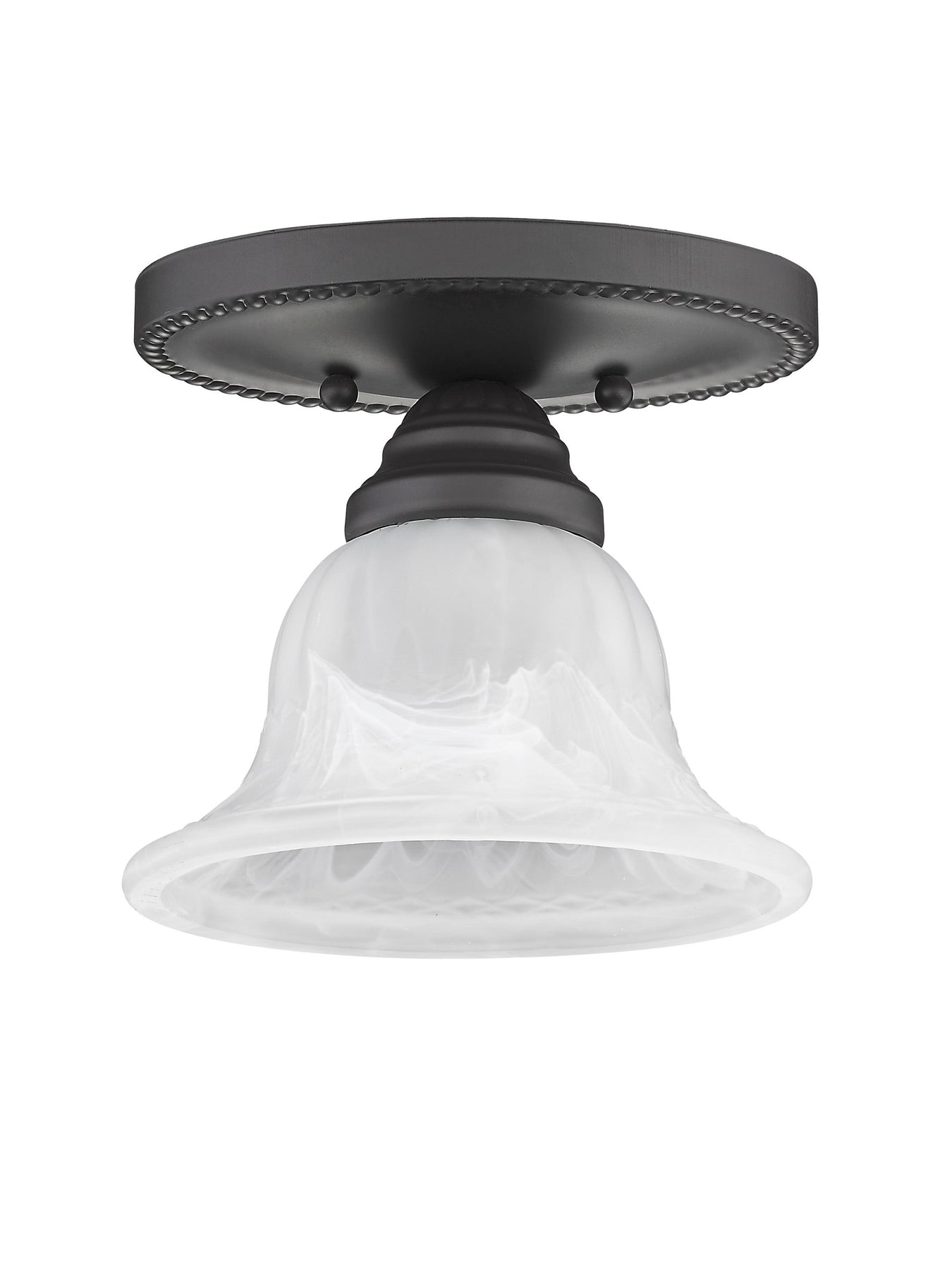 The 1530-07 Edgemont Ceiling Mount fixture is a stylish addition to any traditional decor. Featuring a beautiful white alabaster glass shade, this fixture enhances the warmth of a space while providing ample light with its 100W maximum capacity, using a medium base bulb (not included). Measuring 6 inches in height and with a 7-inch diameter canopy, it fits seamlessly in various locations. The stunning bronze finish adds an elegant touch, and its design is suitable for damp locations, making it versatile for hallways or baths.
