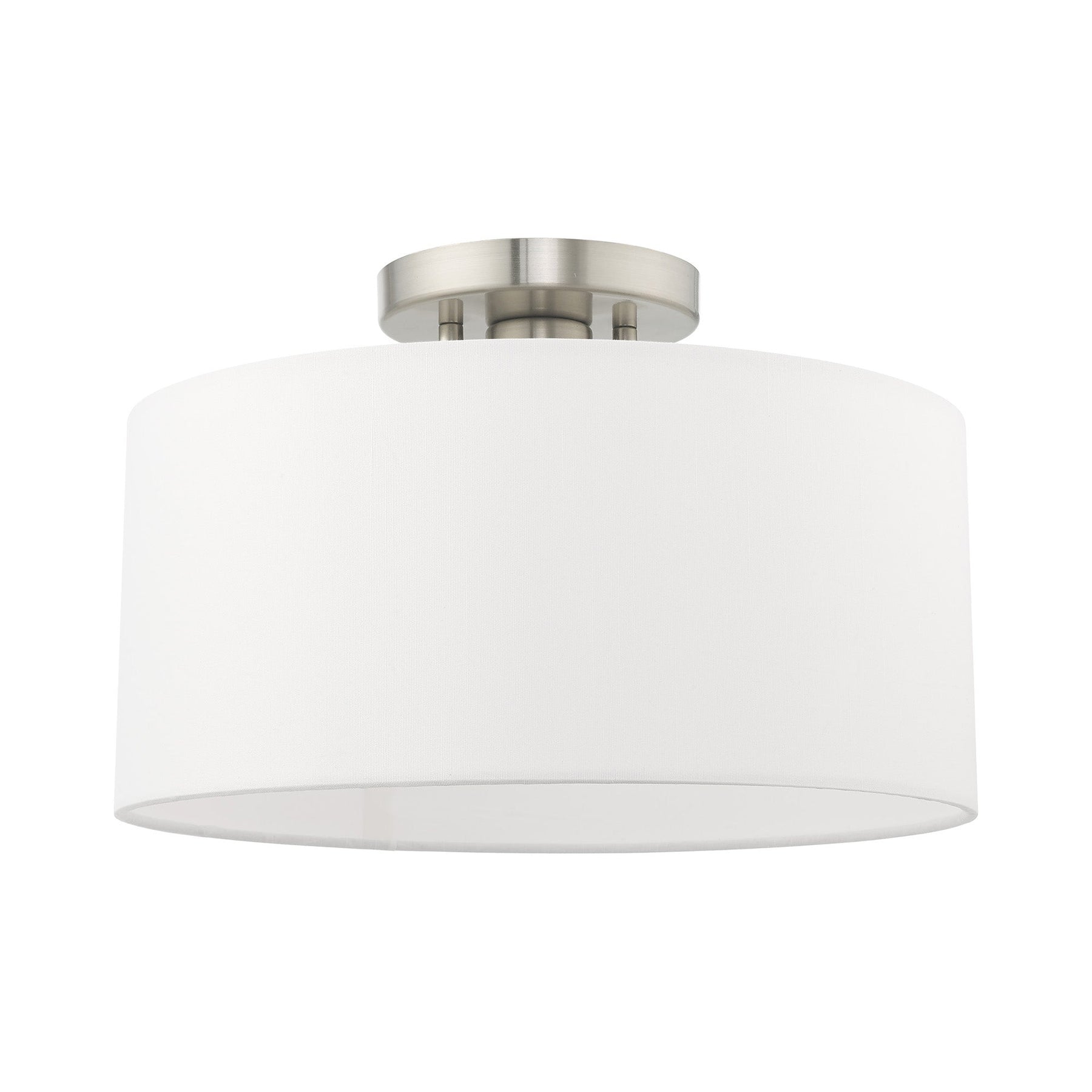 The 41097-91 Meridian Semi-Flush Mount is an elegant lighting fixture that combines simplicity with sophistication. Finished in brushed nickel, it features a beautifully hand-crafted off-white fabric hardback shade that emits a soft, inviting glow. With a height of 8.5 inches and a diameter of 13 inches, this ceiling mount is designed to accommodate one medium base bulb (not included) with a maximum wattage of 60W. Its transitional style and open bottom design allow for effortless relamping, making it a perfect fit for various interiors, while also being suitable for damp locations.