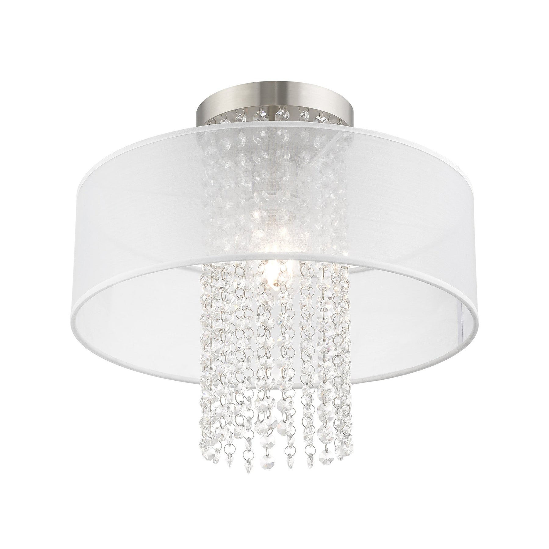 The Bella Vista Semi-Flush Fixture in Brushed Nickel is an elegant lighting option that combines modern design with timeless sophistication. Measuring 13.5 inches in height and featuring a diameter of 15 inches, this fixture showcases a hand-crafted translucent fabric shade adorned with clear crystal strands that cascade in a stunning waterfall effect. Designed to accommodate one medium base bulb (not included) with a maximum wattage of 60W, it is suitable for damp locations, making it perfect for areas like bathrooms. With its New Traditional and glamorous style, the Bella Vista is ideal for adding a sparkling touch to any room.