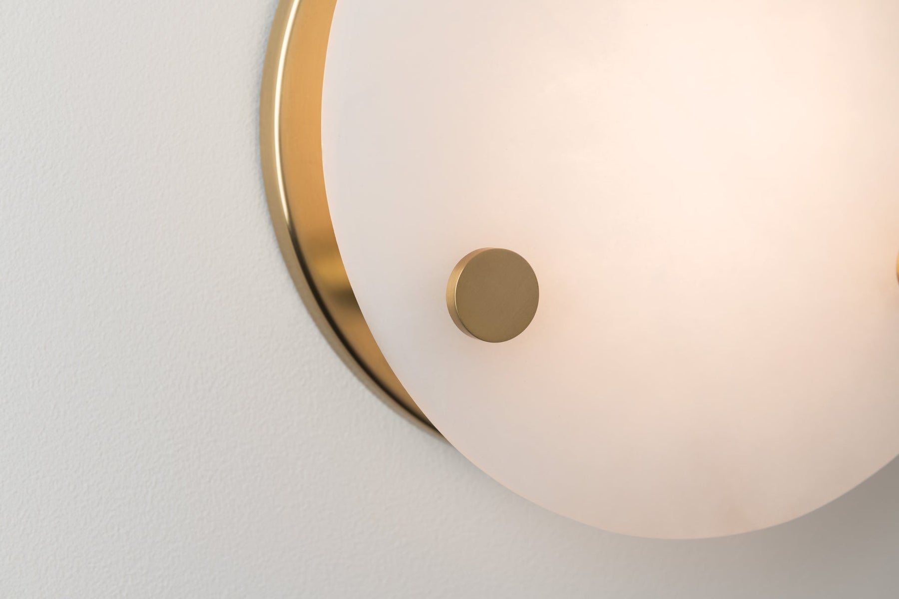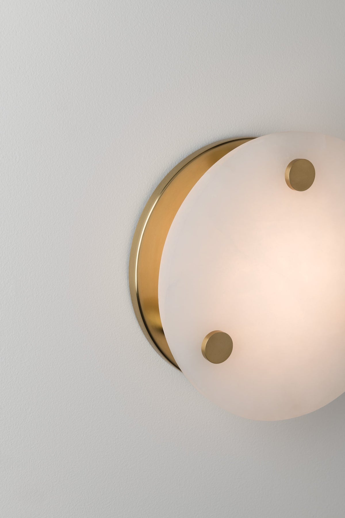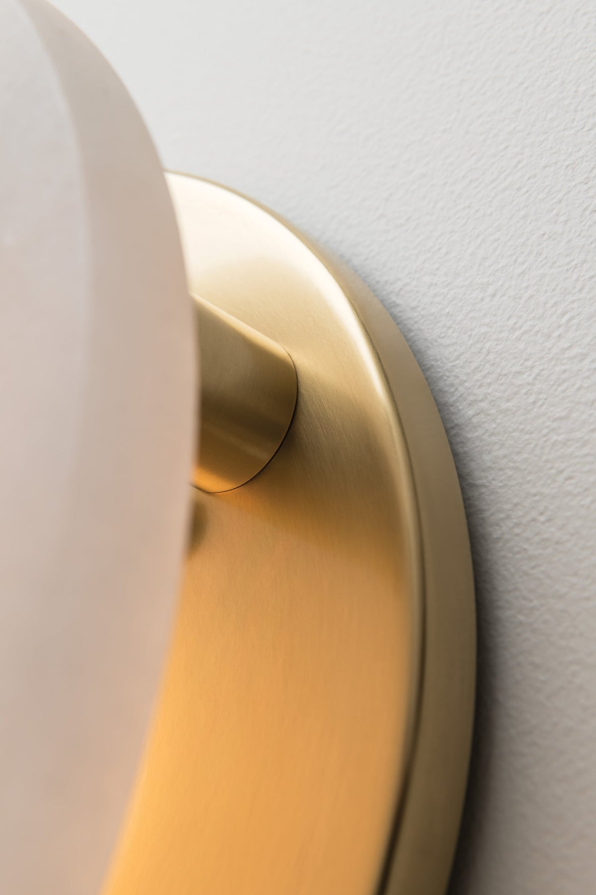 The Croton Wall Sconce by Hudson Valley Lighting is a sophisticated addition to any interior space, featuring a stunning frosted glass shade that exudes a warm ambiance. It requires one integrated LED socket, providing an impressive output of 650 lumens with a color temperature of 3000K. With a diameter of 12.25 inches and a height of 3.25 inches, this fixture boasts a CRI of 90 for true color representation. The Aged Brass finish adds a touch of elegance, while its design is field serviceable for easy maintenance. Note that this fixture is not recommended for damp locations.