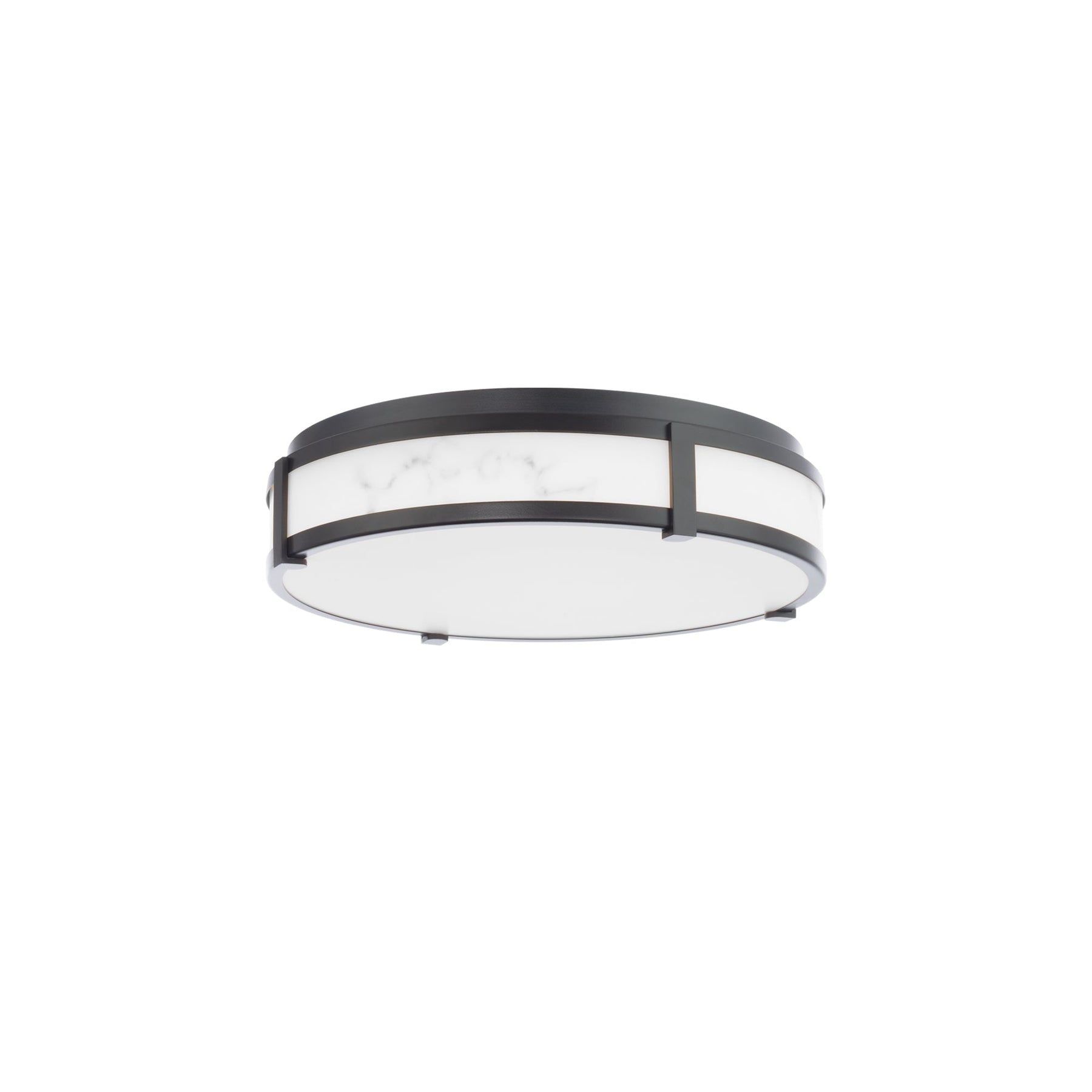Constantine 18in LED Flush Mount 3000K in Black. Aged brass or black aluminum hardware with faux alabaster. Like real stone, the new Constantine dweLED indoor flush mount creates a stunning, warm and clean aesthetic as an eye-catching centerpiece. Each piece is unique and includes an etched acrylic diffuser for beautiful ambient illumination in a bath, living area or guest room. Available in an 18 inch and 14 inch diameter. Utilizes state of the art LEDs with a high 90 color rendering index and correlated color temperature of 3000 Kelvin. The canopy conceals a 120 volt LED driver. The LEDs have a long 50,000 hour rated life and deliver up to 1500 or more lumens. The LED luminaire is ETL and cETL listed for damp locations. It is California Title 24 rated and meets the highest energy efficient requirements. Dims beautifully using an electronic low voltage or TRIAC dimming system. Curvaceous with a stunning textured look. Constructed with a solid aluminum frame and an etched acrylic diffuser. Features a faux alabaster diffuser that creates a bright and even illumination. Constantine is damp location listed - can be used indoor or covered outdoor areas. It can be ceiling or wall mounted to suit any application. Available in a 14inch or 18 inch diameter. Includes a replaceable LED driver that is concealed within the frame. Smooth and continuous dimming with electronic low voltage ELV, or TRIAC dimmer options. High Powered Replaceable LED Module CRI: 90, Rated Hours: 50000, Color Temp: 3000K Standards: ETL & cETL UL 1598 listed with IP44 rating for Damp Locations. CEC Title 24 compliant.