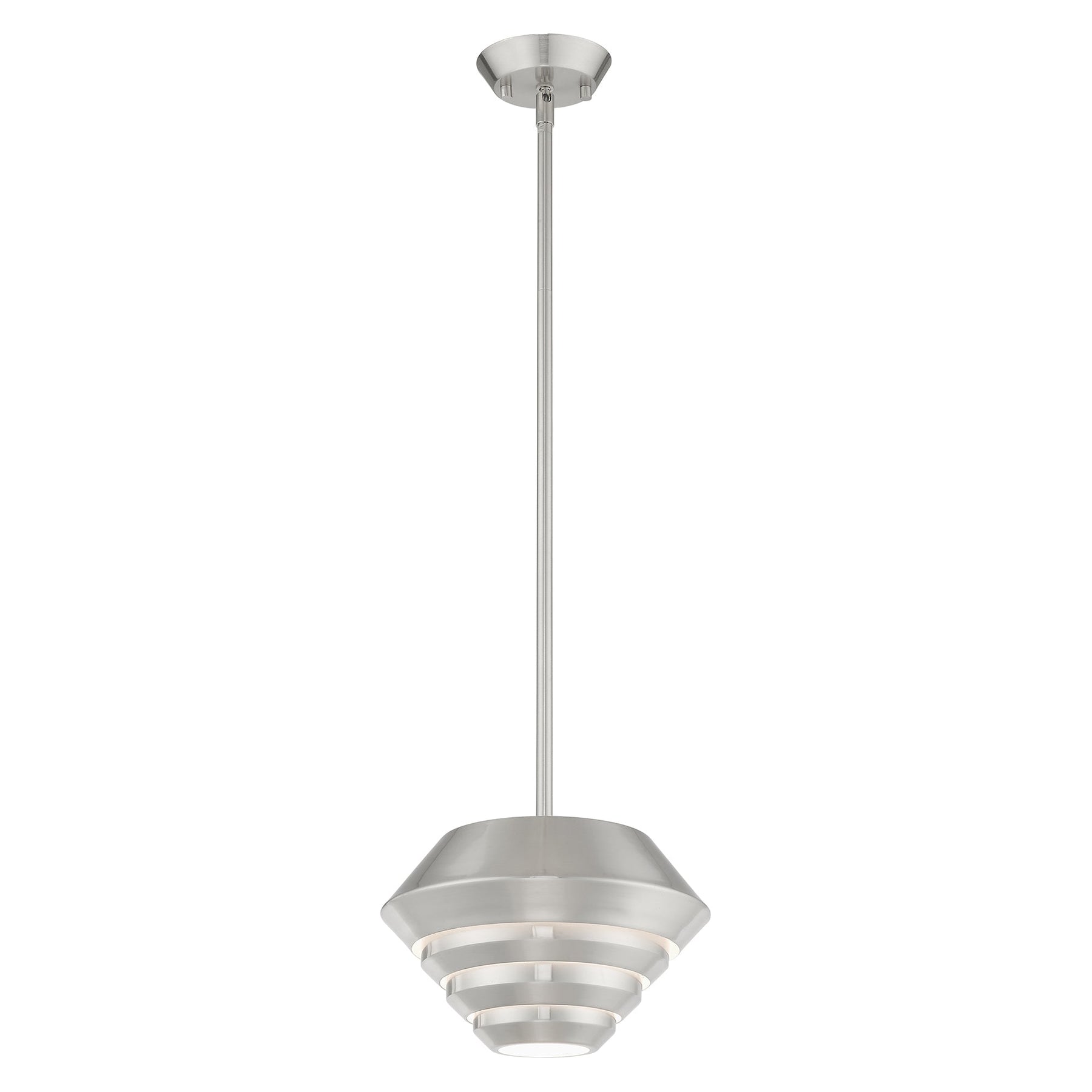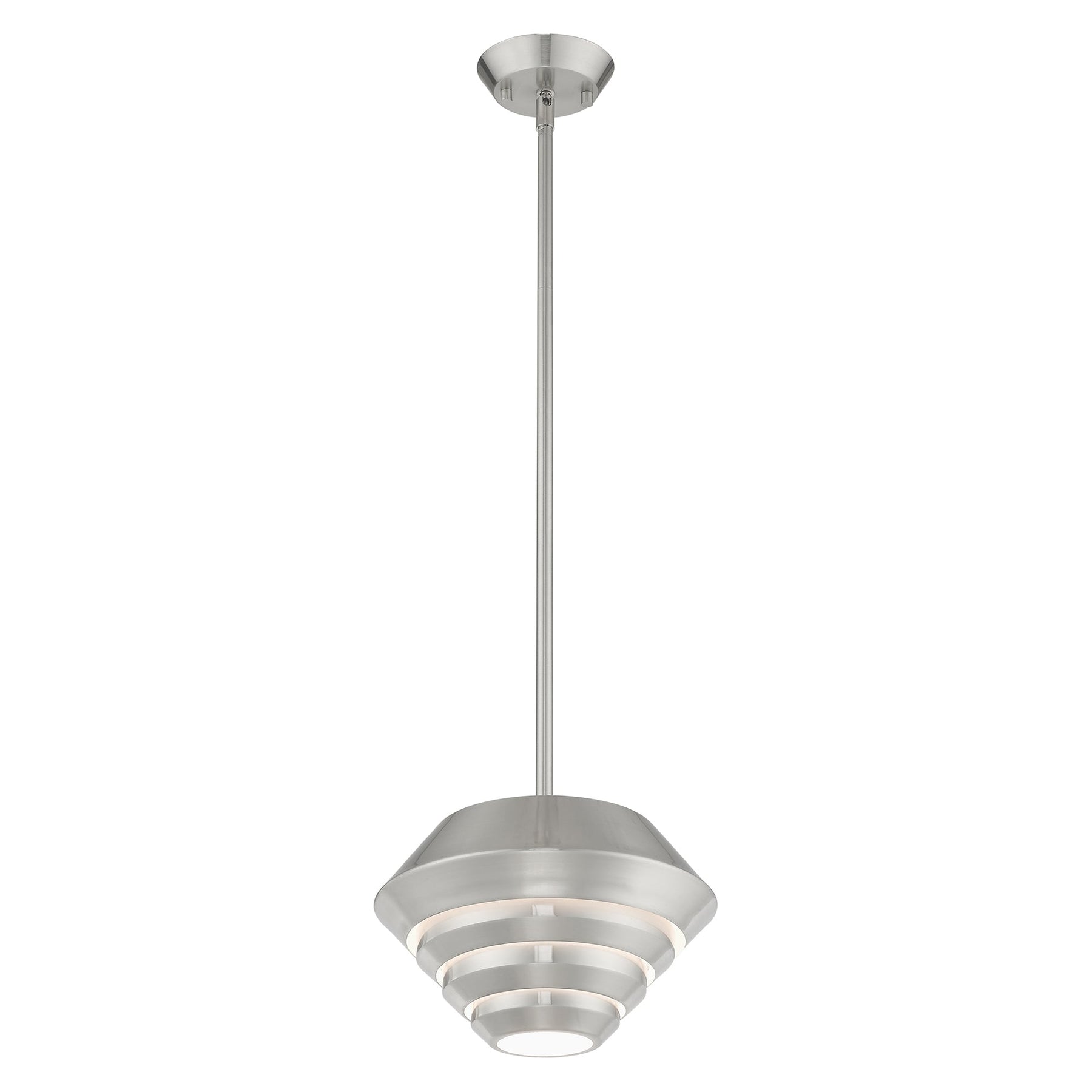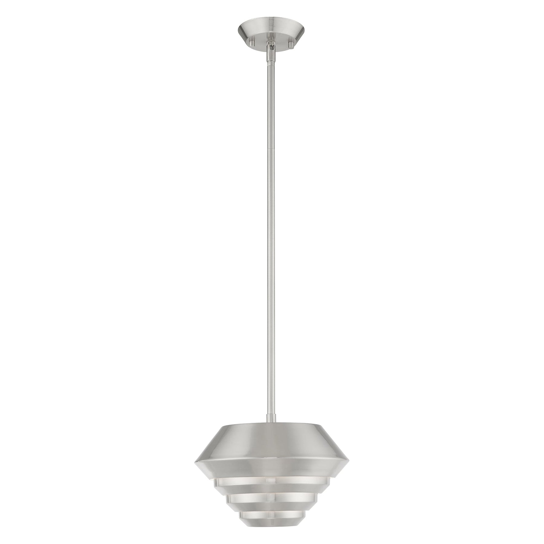 The Amsterdam mini pendant, item number 40401-91, is a stunning example of Art Deco design, featuring a brushed nickel finish and a sculptured metal shade that embodies elegance and functionality. It measures 16 to 46 inches in height and has a diameter of 10 inches, making it a versatile choice for any space. This fixture accommodates one medium base bulb with a maximum wattage of 60, providing ample lighting. With an 8-foot wire and included stem sections of 6, 12, and 18 inches, it is adaptable for various ceiling heights and is suitable for damp locations, making it perfect for kitchens or bathrooms.