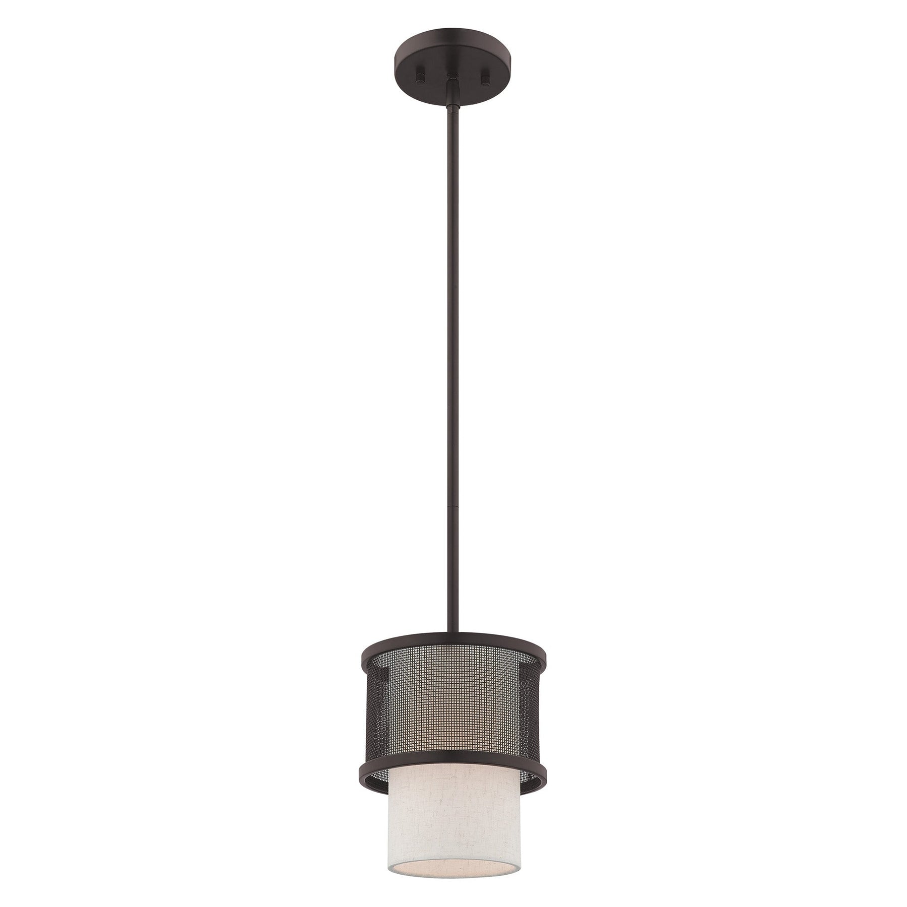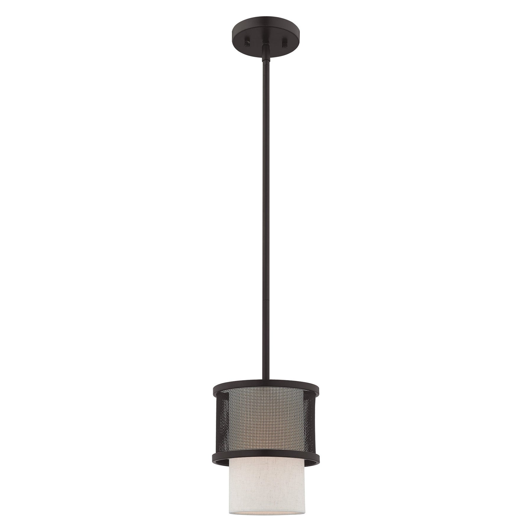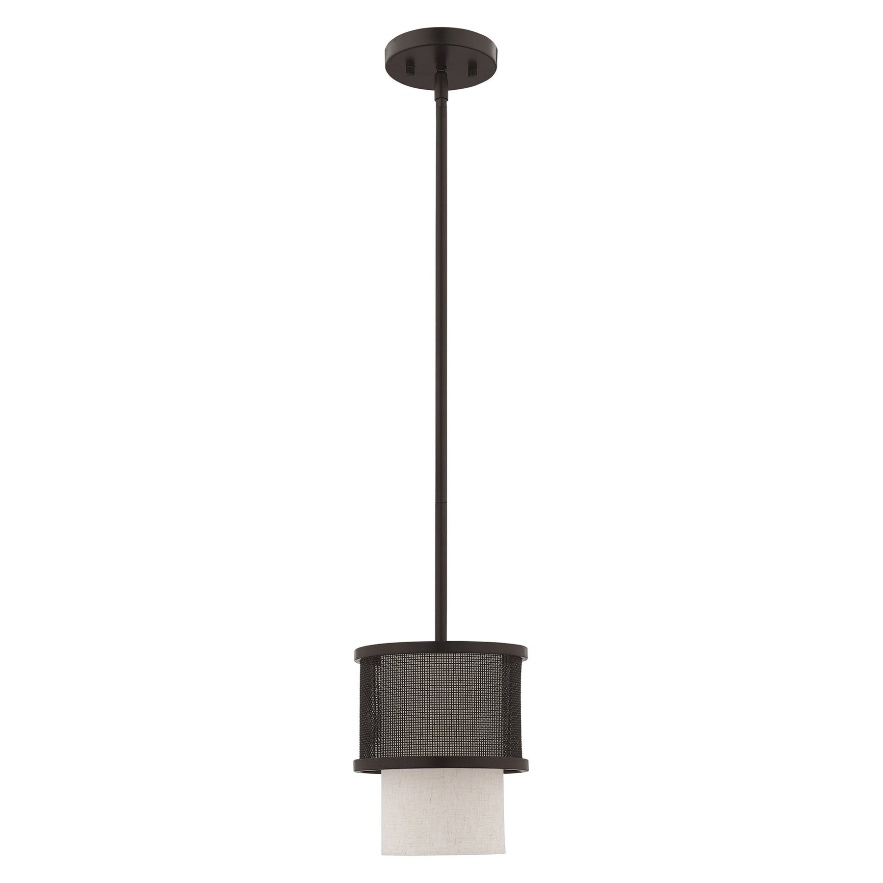 The 41201-07 Braddock Mini Pendant is the perfect addition to any contemporary space, showcasing a sophisticated urban bronze finish. This pendant features a 7-inch diameter with an adjustable height ranging from 16.75 to 46.75 inches, making it versatile for various ceiling heights. Equipped with a hand-crafted oatmeal fabric hardback shade enveloped in a stainless steel mesh outer shade, it provides a warm and inviting glow. The fixture accommodates one medium base bulb with a maximum wattage of 40W (not included) and includes three stem sections (6\