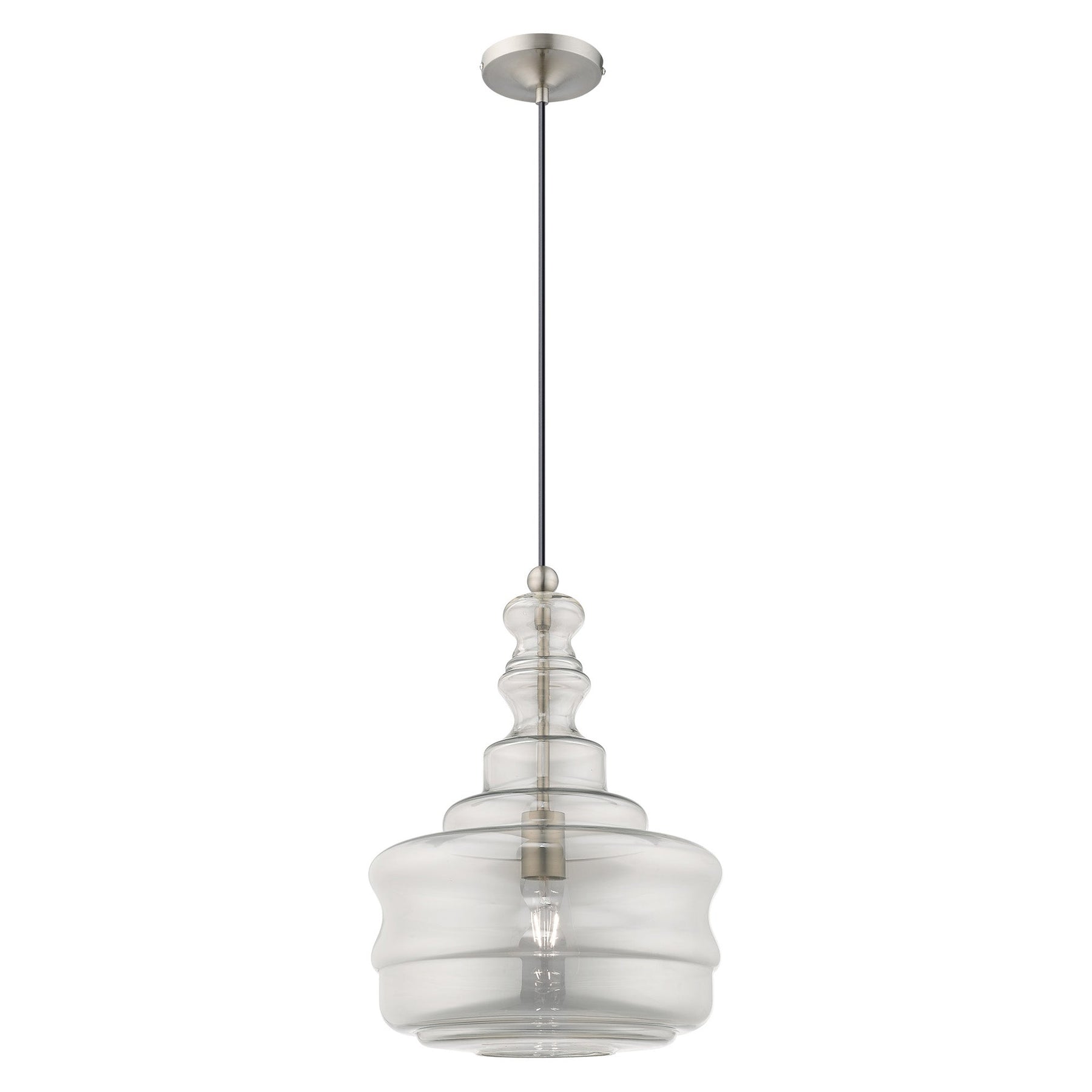 The 41246-91 Art Glass Mini Pendant is a captivating addition to any room, blending retro aesthetics with contemporary style. This fixture features a stunning hand-blown smoke glass shade and an elegant brushed nickel finish, showcasing a transitional design that suits a variety of decor styles. With adjustable height ranging from 19.25 inches to 90 inches and a diameter of 12.625 inches, it provides versatile installation options. Designed to accommodate sloped ceilings, this mini pendant uses a single medium base bulb (not included) with a maximum wattage of 60W. The pendant is suitable for damp locations, making it a practical choice for spaces like bathrooms or covered patios.