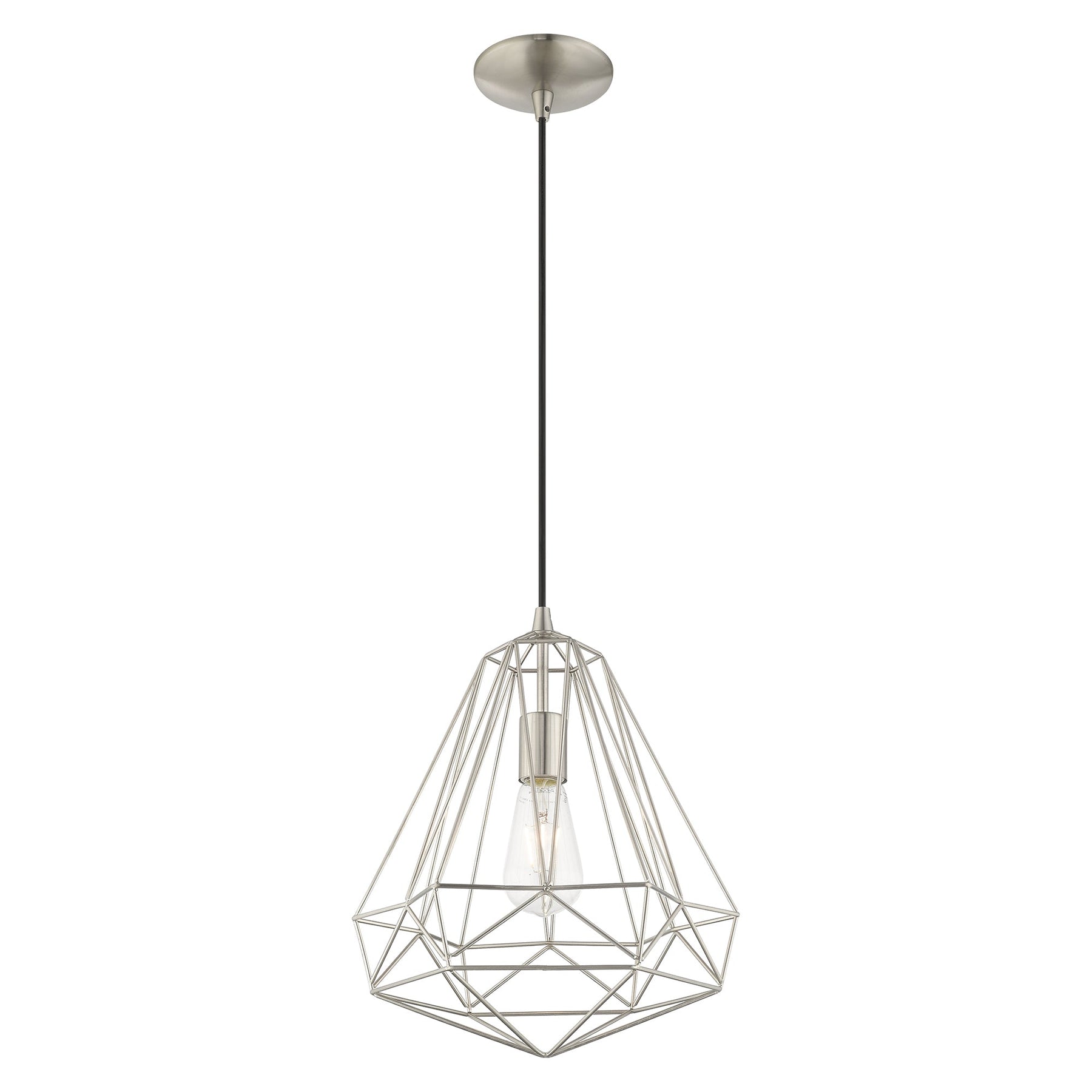 The 41324-91 Knox Mini Pendant is a striking lighting feature that combines contemporary design with functionality. It has a height adjustable range from 18 inches to 80 inches and a diameter of 12.25 inches, making it versatile for various spaces. The brushed nickel geometric metal shade not only enhances its modern aesthetic but is also suitable for damp locations. This pendant requires a single medium base bulb with a maximum wattage of 60W (bulb not included) and comes with a 6-foot wire, allowing for easy installation in various settings, including those with sloped ceilings.