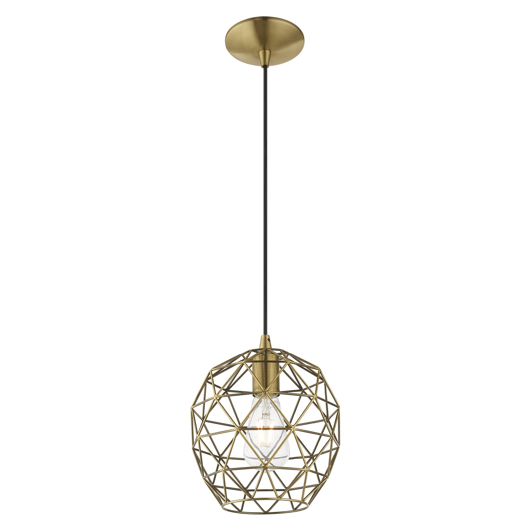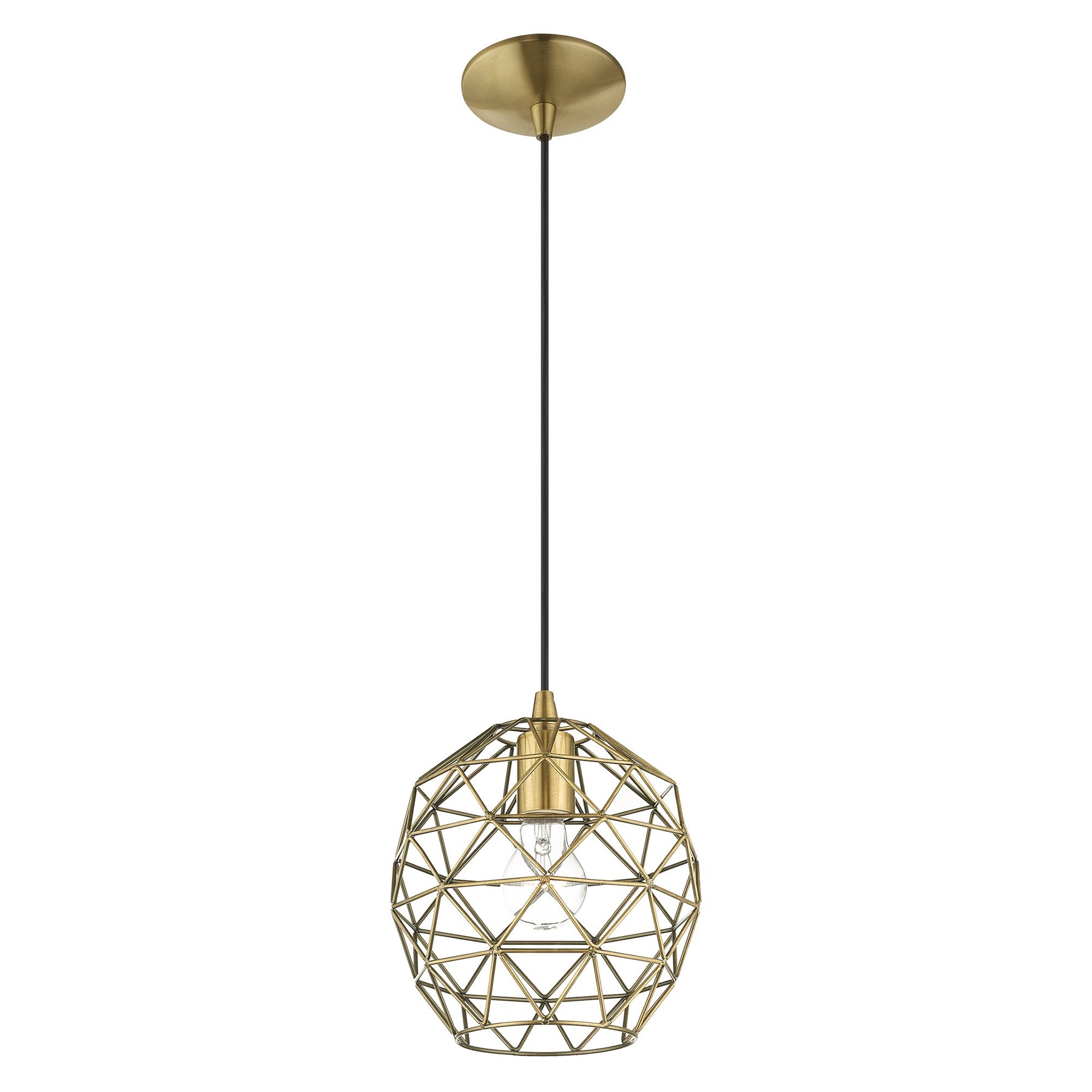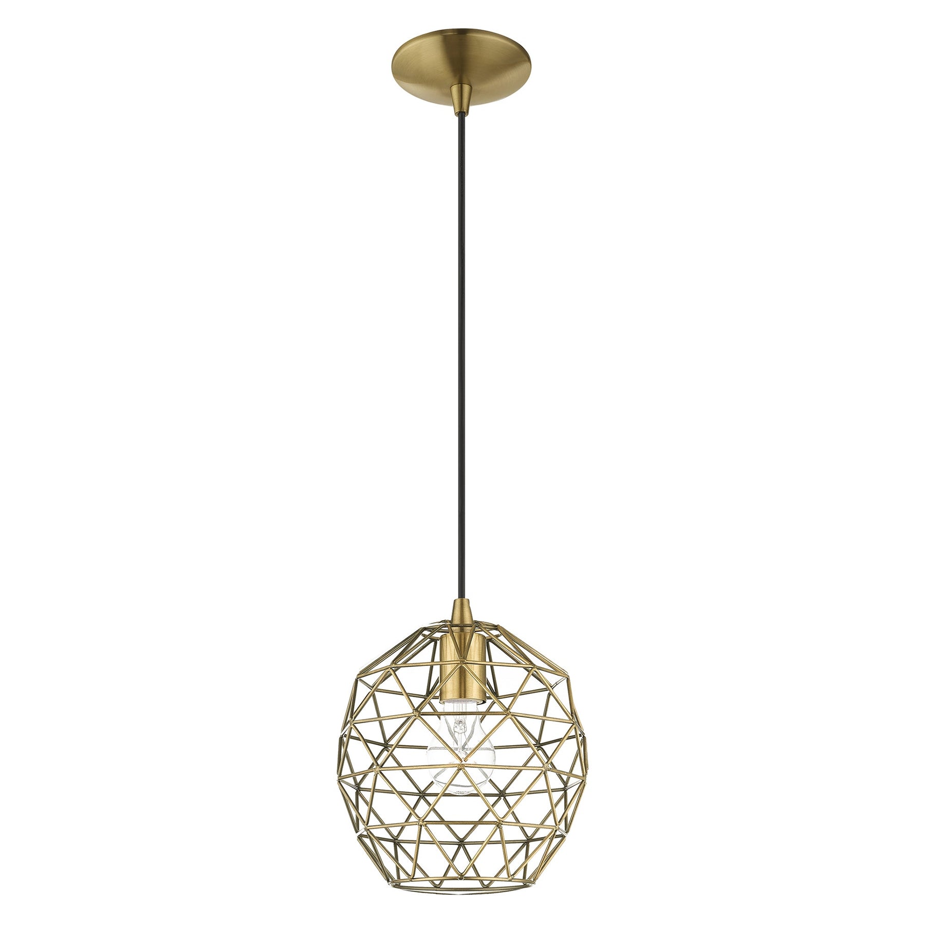 The 41326-01 Geometrix Mini Pendant in Antique Brass is a stylish blend of contemporary design and versatility. This fixture features a geometric metal shade and accommodates one medium base bulb (not included) with a maximum wattage of 60W. With a height adjustable from 13 inches to 75 inches and a diameter of 8 inches, this pendant is perfect for various ceiling heights. Its 5-inch canopy allows for easy installation, and it is suitable for damp locations, making it an excellent choice for kitchens and dining areas.