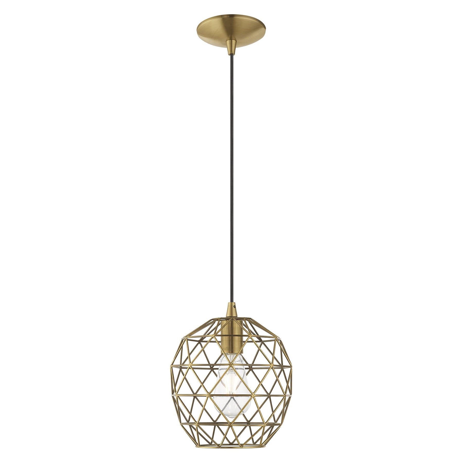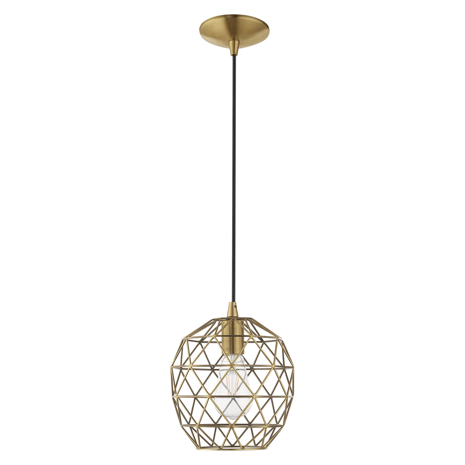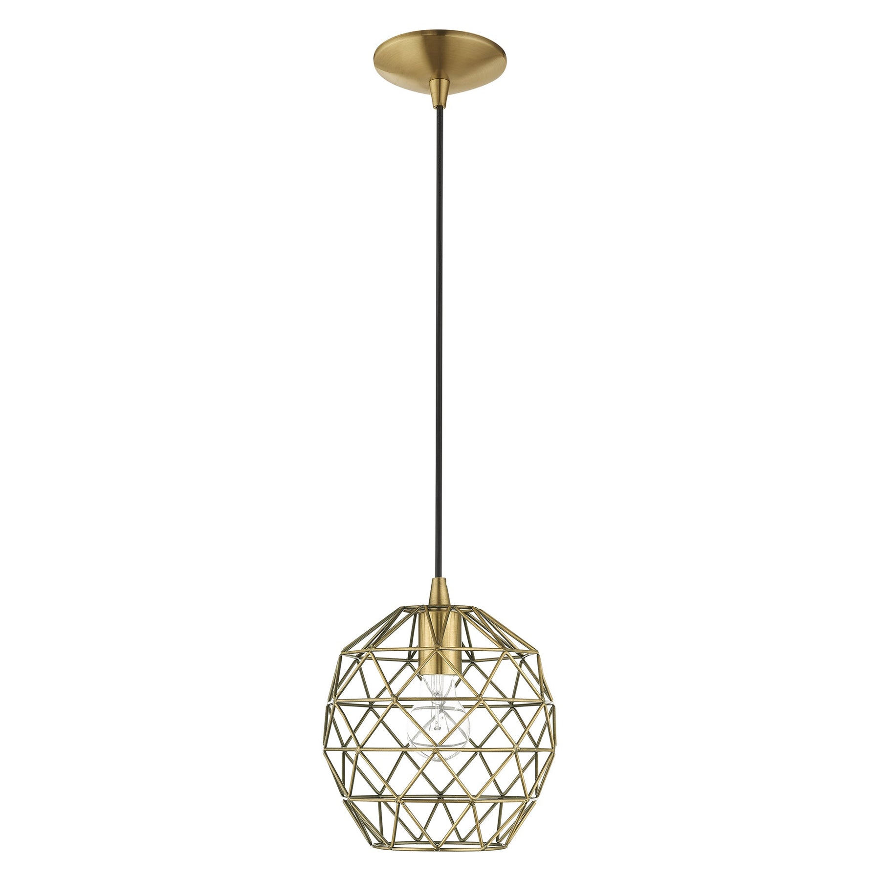 The 41326-01 Geometrix Mini Pendant in Antique Brass is a stylish blend of contemporary design and versatility. This fixture features a geometric metal shade and accommodates one medium base bulb (not included) with a maximum wattage of 60W. With a height adjustable from 13 inches to 75 inches and a diameter of 8 inches, this pendant is perfect for various ceiling heights. Its 5-inch canopy allows for easy installation, and it is suitable for damp locations, making it an excellent choice for kitchens and dining areas.