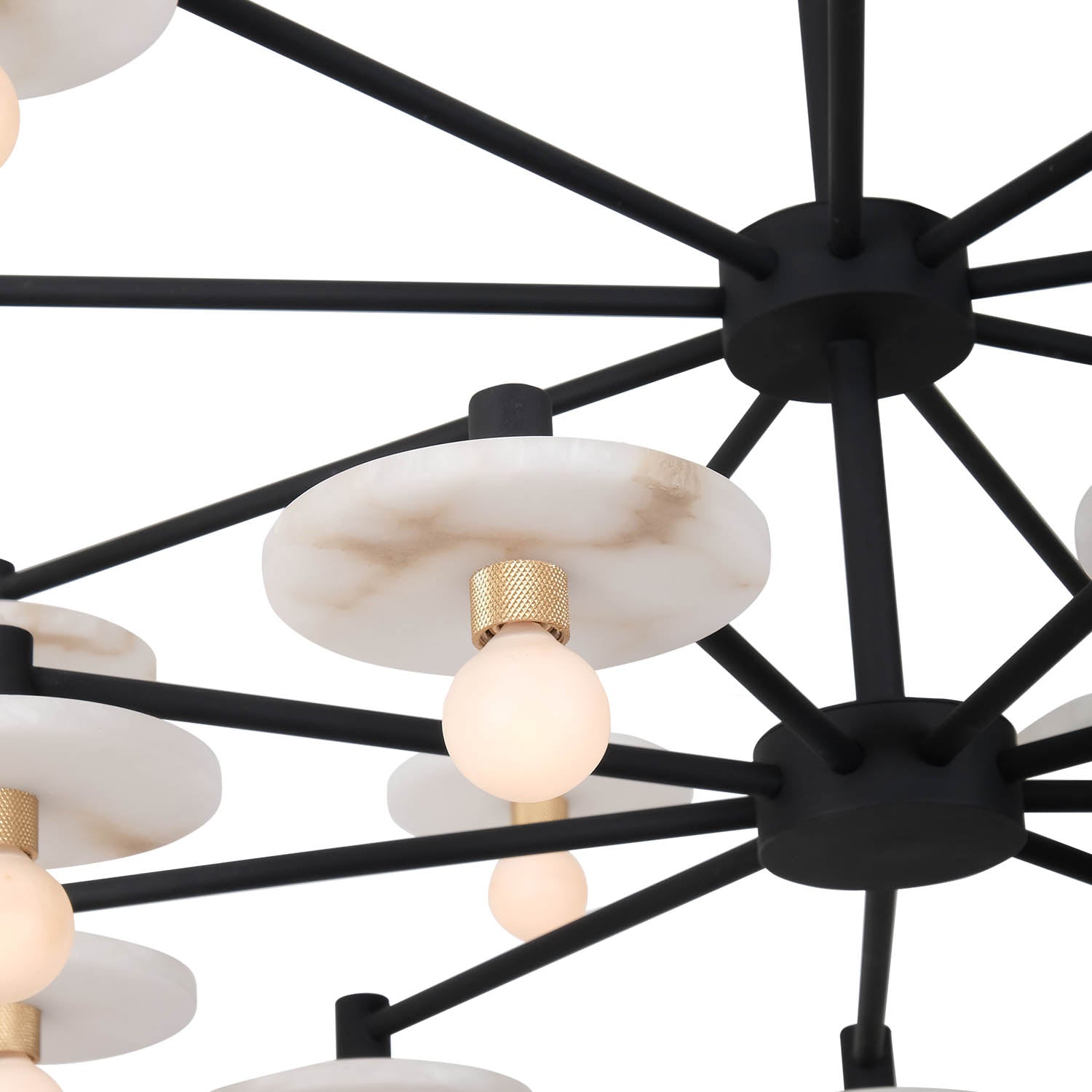 The Discus 2-Tier Pendant in Matte Black is an exquisite addition to your space, featuring a harmonious blend of steel and alabaster. With dimensions of 42 inches in diameter and 22.5 inches in height, this pendant is designed to enhance both modern and transitional decor. It requires 18 candelabra bulbs, which are included, and is dimmable for customizable ambiance. With a hanging weight of 28 lbs and a 96-inch wire length, it is suitable for low ceilings, making it both functional and stylish. The pendant is UL Damp rated, making it ideal for use in humid areas like kitchens or bathrooms.
