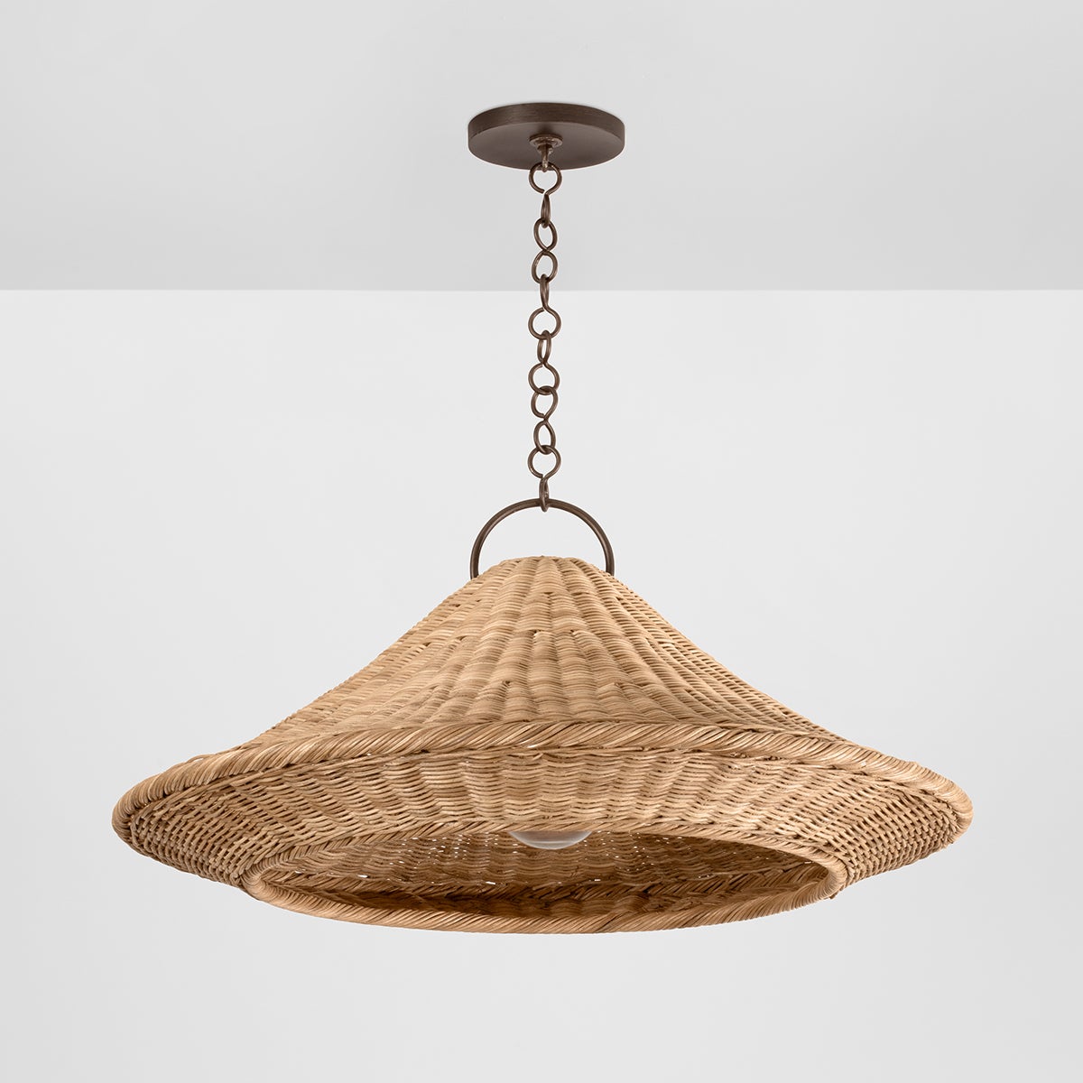 The Baychester Pendant Light by Hudson Valley Lighting combines elegance and functionality with its unique rattan shade in a striking Bronze Leaf finish. Measuring 32 inches in diameter and 15 inches in height, this pendant requires one E26 medium base bulb (not included) with a maximum wattage of 25W. Its sophisticated design makes it perfect for a variety of spaces, while its UL Dry rating ensures it is safe for indoor use.